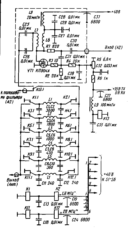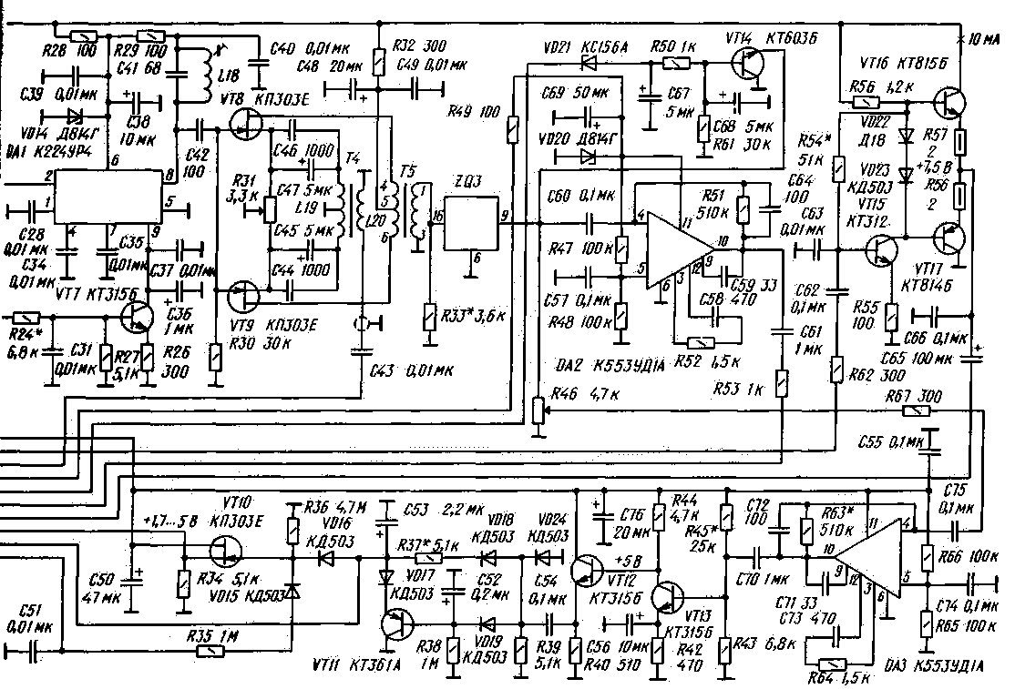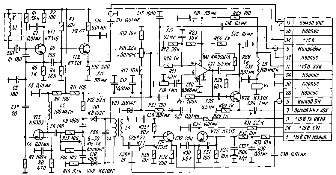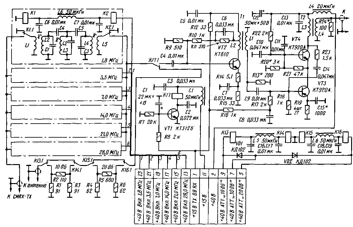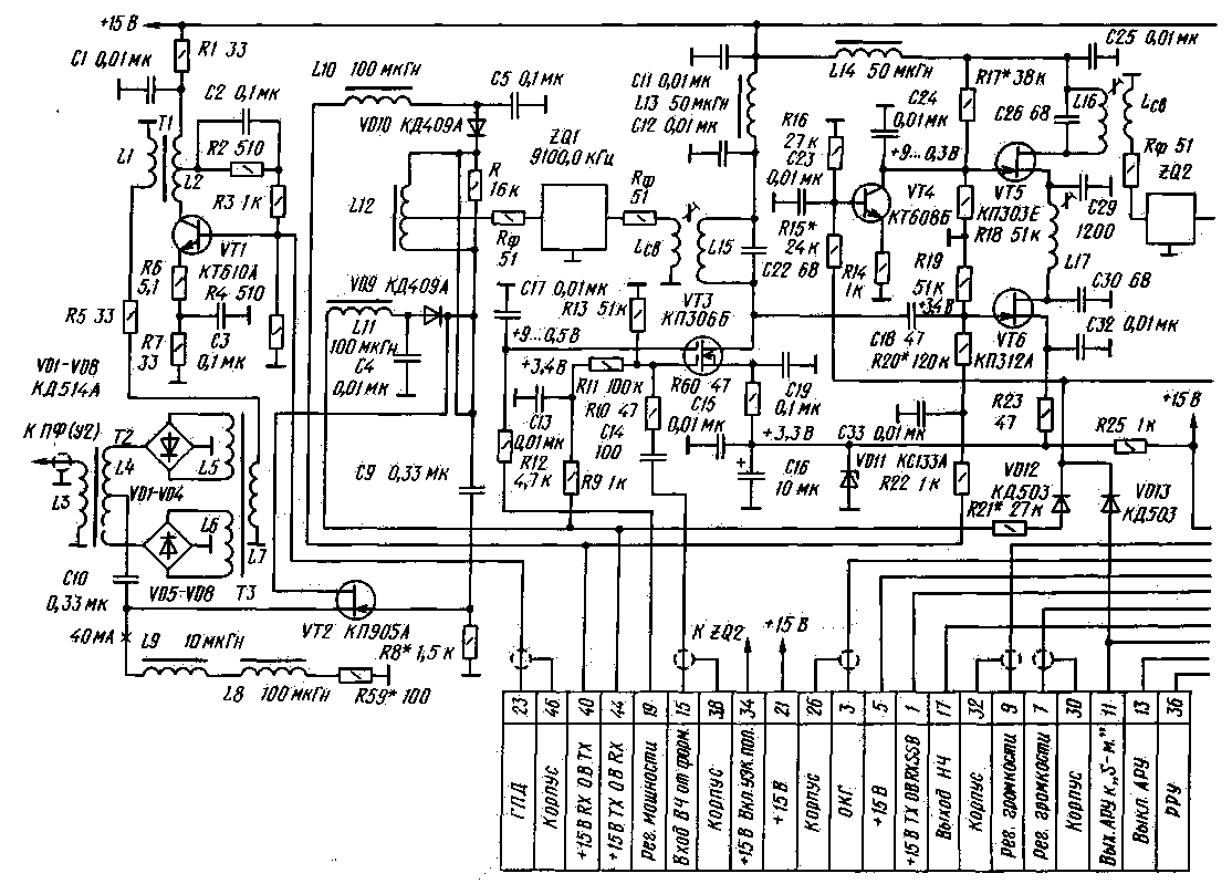 Если в фильтре ZQ1 будут использованы кварцевые резонаторы от радиостанции "Гранит" с частотами 9000...9150 кГц, то значения емкостей в схеме фильтра могут остаться без изменений. В фильтре ZQ2 полоса пропускания может изменяться. В режиме SSB она равна 2,3 кГц, а в режиме CW, когда параллельно кварцевым резонаторам включены конденсаторы величиной 68 пФ, полоса пропускания сужается до 800 Гц. При передаче каскад на транзисторе VT2 является истоковым повторителем. Реверсирование режима работы этого каскада осуществляется коммутирующими напряжениями с шин управления. При приеме +15 В в шине Rх 0 В в шине Тх. При передаче 0 В в шине Rx, +15 В в шине Тх. Диодные ключи VD9 и VD10 подключают "горячий" конец автотрансформатора L12 к стоку транзистора при приеме или к его затвору при переходе на передачу. Заземление "холодного" конца автотрансформатора L12 по высокой частоте при приеме происходит через диодный ключ VD10 и конденсатор С5, при передаче - через диодный ключ VD9 и конденсатор С4. На транзисторах VT5, VT6 собран первый каскад УПЧ, имеющий усиление около 20 дБ. П-контур L17C29C30 позволяет согласовать транзисторы каскодной схемы и осуществить дополнительную фильтрацию полезного сигнала. Нагрузкой каскада является контур L16C26. Согласование со вторым кварцевым фильтром ZQ2 осуществляется с помощью катушки связи Lсв. Этот фильтр собран по лестничной схеме на 4 кварцах, имеет полосу пропускания по уровню 3 дБ, равную 2,6 кГц. В режиме приема телеграфных сигналов он переключается с помощью реле типа РЭС-49 на узкую полосу около 0,7 кГц путем подключения параллельно кварцам фильтра емкостей, равных примерно 68 пФ. Применение двух кварцевых фильтров ZQ1 с полосой пропускания 2,4 кГц и ZQ2 значительно улучшило подавление сигналов вне полосы "прозрачности" фильтров, которое достигло 100 дБ. Основное усиление сигнала производится каскадом на микросхеме DA1 К224УР4 (К2УС248 - старое обозначение). Смесительный детектор на транзисторах VT8, VT9 особенностей не имеет. Между детектором и входом предварительного усилителя низкой частоты на микросхеме DA2 включен ФНЧ ZQ3 типа Д3,4 (от радиостанций "Гранит"), который улучшает шумовые и избирательные параметры приемного тракта. Выходной каскад УНЧ собран по обычной схеме на транзисторах VT15, VT16, VT17. На транзисторе VT14 собран электронный ключ, с помощью которого шунтируется вход УНЧ в режиме передачи. В телеграфном режиме этот ключ закрыт, что позволяет прослушивать сигнал самоконтроля при передаче. Схема АРУ состоит из предварительного усилителя АРУ DA3, VT13, эмиттерного повторителя VT12, детекторов АРУ VD18, VD19 и VD24. На транзисторе VT11 и диоде VD17 собрана вспомогательная цепь "быстрого разряда" с временем разряда около 0,2 с. При приеме полезного сигнала время разряда АРУ определяется основной цепочкой R36C53. При исчезновении сигнала происходит быстрый разряд С53 через диод VD17 и транзистор VT11. С истокового повторителя VT10 положительное напряжение АРУ, которое увеличивается с ростом силы сигнала, подается на регулирующие транзисторы VT4 и VT7, управляющие усилением каскадов ПЧ. Для осуществления задержки АРУ исток транзистора VT6 подключается к источнику опорного напряжения, собранного на стабилитроне VD11 и резисторе R25. В режиме передачи на транзисторы VT4, VT7 подается коммутирующее напряжение +15 ВТХ-О BRX, которое практически закрывает тракт ПЧ приемника. На транзисторе VT3 собр