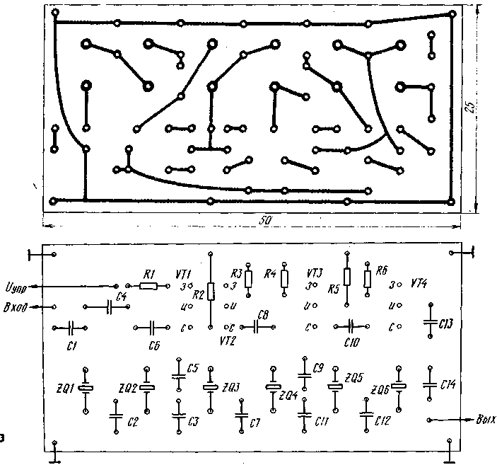 В этом случае полоса пропускания фильтра равна 2,7 кГц. Если же подать напряжение +5...+12 В, полевые транзисторы откроются и конденсаторы С6, С8, С10, С13 подключатся параллельно кварцевым резонаторам. Полоса пропускания сузится до 0,7 кГц. Емкость этих конденсаторов подбирают экспериментально. В отличие от упомянутого выше фильтра в данном конденсаторы подсоединяются не ко всем резонаторам. Это обусловлено тем, что при включении конденсаторов параллельно кварцам уменьшается крутизна низкочастотного ската. В то же время сузить полосу удается, подключив конденсаторы параллельно трем-четырем конденсаторам из шести. Фильтр практически не потребляет электроэнергии, имеет небольшие габариты. Его можно собрать на печатной плате и установить в готовую аппаратуру. Чертеж печатной платы приведен на рис. 3.