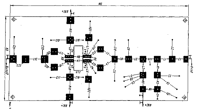 ЭНЦИКЛОПЕДИЯ РАДИОЭЛЕКТРОНИКИ И ЭЛЕКТРОТЕХНИКИ Усилитель мощности УКВ радиостанции. Энциклопедия радиоэлектроники и электротехники Энциклопедия радиоэлектроники и электротехники / ВЧ усилители мощности Двухкаскадный усилитель (рис. 1) предназначен для работы с радиостанцией в диапазоне частот 144... 146 МГц. Его выходная мощность до 100 Вт при мощности возбуждения до 10 Вт. В первом каскаде применяется мощный полевой МДП-транзистор 2П909А, обеспечивающий усиление по мощности 25-30 дБ, уровень шумов не более 2,5 дБ и уровень интермодуляционных искажений не хуже -30 дБ. Второй каскад выполнен по мостовой схеме сложения мощностей на балансном транзисторе КТ9105АС, в котором заметно уменьшено влияние индуктивностей выводов благодаря тому, что значительная их часть является общей на два транзистора. Не требуется также подбирать два транзистора по одинаковым параметрам. Небольшие напряжение питания усилителя и габариты КТ9105АС позволяют решить ряд проблем при конструировании компактной УКВ радиостанции. Усилитель собран на плате из фольгированного стеклотекстолита толщиной 2 мм, размерами 180х185 мм (рис. 2). Детали размещают на одной стороне платы на "пятачках", соблюдая правила монтажа для этого частотного диапазона. Для транзистора 2П909А в плате высверливают отверстие диаметром 11 мм, для КТ9105АС вырезают отверстие прямоугольной формы размерами 10х25 см. Напряжение питания усилителя подают по проводникам в экране, который пропаивают по всей длине платы. Катушки усилителя бескаркасные, наматывают медным посеребренным проводом. Катушки L1, L2 содержат по 3 витка провода диаметром 0,8 мм. Расстояние между витками 2,5 мм, внутренний диаметр 3 мм, индуктивность 0,3 мкГн. Катушки L4, L5, L10, L11 имеют по 2 витка провода 0,8 мм, внутренний диаметр 10 мм, расстояние между витками 2,5...3,0 мм, индуктивность 0,2 мкГн. Катушка L12 содержит 4 витка провода диаметром 1,5 - 1,8 мм. Внутренний диаметр катушки 10 мм, индуктивность 0,3 мкГн. Дроссель L3 - унифицированный ВЧ дроссель Д2 индуктивностью 1 мкГн. Дроссели L6, L7 содержат по 10 витков провода ПЭВ-2 0,33. Они бескаркасные, их внутренний диаметр 2,5 мм, расстояние между витками 1-1,5 мм, индуктивность 0,4 мкГн. Дроссели L8, L9 имеют по 10 витков провода ПЭВ-2 0,8. Намотка бескаркасная, внутренний диаметр 6 мм, индуктивность 0,6 мкГн. Конденсаторы С1 и С2 - КПК-МН, КПКМН. Остальные подстроечные конденсаторы - с воздушным диэлектриком КПВ, КПВМ. Постоянные конденсаторы - безвыводные любого типа. Стабилитрон VD1 любого типа на 15 В (0,5 Вт). Диоды VD2, VD3 2Д212 (А или Б) или КД212А, 2Д215В, КД226А, КД212В, КД208А. Очень удобно использовать ЧИП-компоненты. Выпускаемые ЧИП - индуктивности, имеют индуктивность от 0,1 до 1000 мкГн, их размеры 4,5х3,2 мм; 3,2х2,5 мм. Безвыводные резисторы и конденсаторы (имеют допуск 2%) изготавливаются в плоских корпусах. Специальная конструкция выводов улучшает монтаж и качество соединений деталей. Минимальное расстояние от корпуса транзистора 2П909А до места пайки выводов 1,0-1,5 мм. Температура пайки не более +250° С. Время пайки не более 3 с. У транзистора КТ9105АС изгиб выводов допускается не ближе 3 мм от корпуса, а пайка не ближе 1 мм при температуре не более +265° С в течение 4 с. Монтаж транзистора можно выполнить' методом пайки фланца к теплоотводу при температуре не более + 150° С в течение 2 мин. Теплоотвод усилителя имеет ребристую поверхность высотой 50 мм, общая площадь