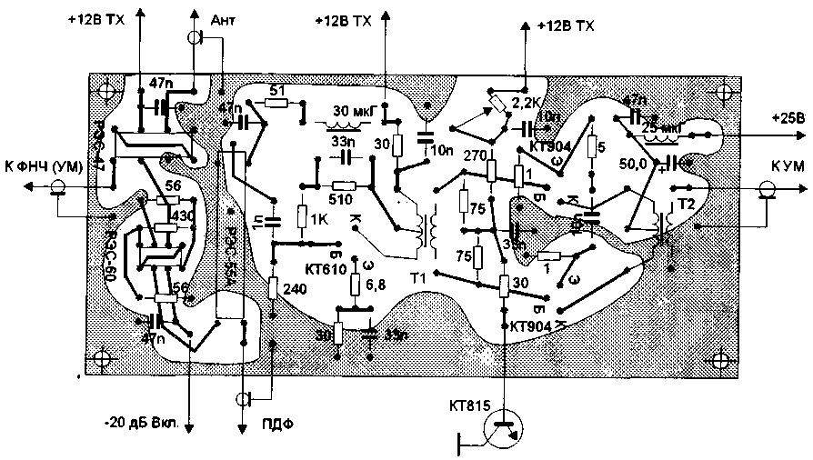 Âûõîäíûå òðàíçèñòîðû ÊÒ904 âïàèâàþòñÿ íåïîñðåäñòâåííî â ïå÷àòíóþ ïëàòó áîëòàìè ââåðõ, íà êîòîðûå âïîñëåäñòâèè ïðèâîðà÷èâàåòñÿ íåáîëüøîé ðàäèàòîð èç äþðàëþìèíèÿ ðàçìåðîì 20õ50õ5 ìì. Íà ýòîì æå ðàäèàòîðå óñòàíàâëèâàåòñÿ è òðàíçèñòîð ÊÒ815, ïðåäíàçíà÷åííûé äëÿ ñòàáèëèçàöèè òîêà ïîêîÿ (80 ìÀ) âûõîäíûõ òðàíçèñòîðîâ.