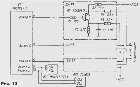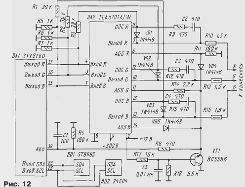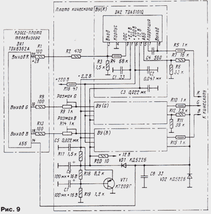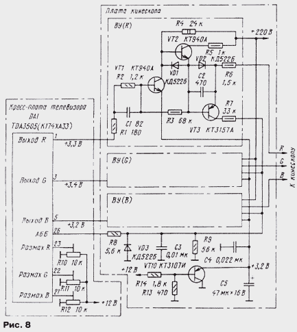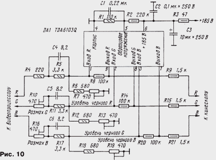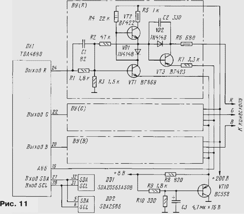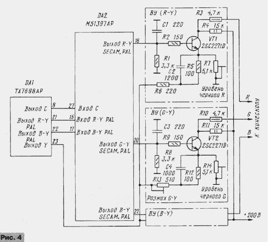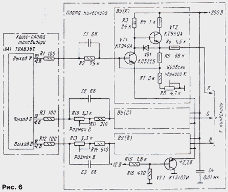 ЭНЦИКЛОПЕДИЯ РАДИОЭЛЕКТРОНИКИ И ЭЛЕКТРОТЕХНИКИ Схемотехника выходных усилителей. Энциклопедия радиоэлектроники и электротехники Энциклопедия радиоэлектроники и электротехники / Телевидение В моделях цветных телевизоров каждого поколения довольно существенно изменялась схемотехника. Коснулись такие изменения и выходных видеоусилителей, о которых рассказано в публикуемом материале. Автор приводит интересные сведения о параметрах элементов видеотракта, в который входят видеоусилители, объясняет, почему требуется расширение его полосы пропускания существенно больше стандартного значения в 6,25 МГц, дает рекомендации по совершенствованию видеоусилителей старых телевизоров. Выходной видеоусилитель (ВУ), связывающий видеопроцессор (ВП) с кинескопом, - необходимая и важная часть каждого телевизора. Вопросы его построения и расчета, к сожалению, мало рассмотрены в отечественной литературе. Единственной книгой, в которой содержится подробное изложение всех проблем, можно считать [1]. Частично этот пробел восполняют сведения, излагаемые в справочниках серии "Ремонт", выпускаемые фирмой "Солон". К ВУ предъявляют высокие требования - они должны обеспечивать большой коэффициент передачи КП в очень широком интервале частот при минимальных искажениях сигнала. В цепи ВП-ВУ-кинескоп нет переходных конденсаторов, и она представляет собой широкополосный усилитель постоянного тока с высоковольтными выходами, подключенными к электродам кинескопа. Таким усилителям свойственна сильно выраженная зависимость составляющих их элементов друг от друга. По этой причине при рассмотрении возможных схем ВУ приходится учитывать как особенности построения ВП и параметры формируемых ими сигналов, так и характеристики кинескопа. Начнем с выходного звена этой цепи - кинескопа. Любой кинескоп, как известно, имеет входы двух видов, на которые может быть подан модулирующий сигнал: катод и сетка (модулятор) у черно-белого кинескопа, катоды и сетки (модуляторы) у цветного. В отечественных черно-белых телевизорах видеосигнал почти всегда поступает на катод кинескопа, а модулятор или соединен с общим проводом, или к нему подведены импульсы гашения луча при обратном ходе разверток. Подача видеосигнала на модулятор практиковалась только в первых моделях телевизоров. Преимуществом такого способа была возможность снижения размаха модулирующего напряжения. Однако при этом требовался сигнал положительной полярности, что не согласовывалось с установившимся в дальнейшем использованием сигналов отрицательной полярности (синхроимпульсами вниз) в тракте цветности. ВУ таких телевизоров, как правило, однокаскадный и до появления транзисторов был собран на лампе 6П9, 6П15П или пентодной части лампы 6Ф4П и их аналогах. Такой ВУ относительно прост. Примененные в нем детали устанавливали режим работы ламп, составляли цепи ООС и коррекции АЧХ. Цепь ООС улучшала линейность амплитудной характеристики ВУ, что обеспечивало повышение числа различимых градаций яркости до нормы в восемь ступеней серой шкалы испытательной таблицы. Цепи коррекции АЧХ, в которых первоначально включали относительно большое число катушек, сохраняли постоянство коэффициента передачи КП в полосе частот видеосигнала, что создавало условия для получения изображения хорошего качеств