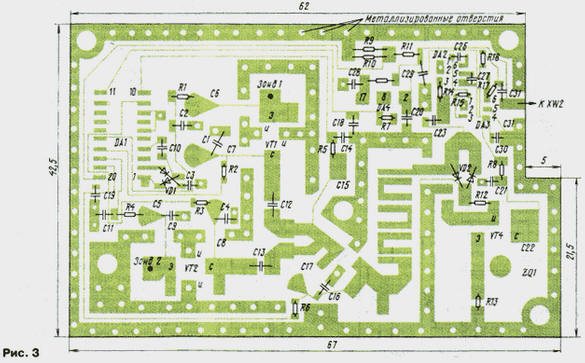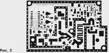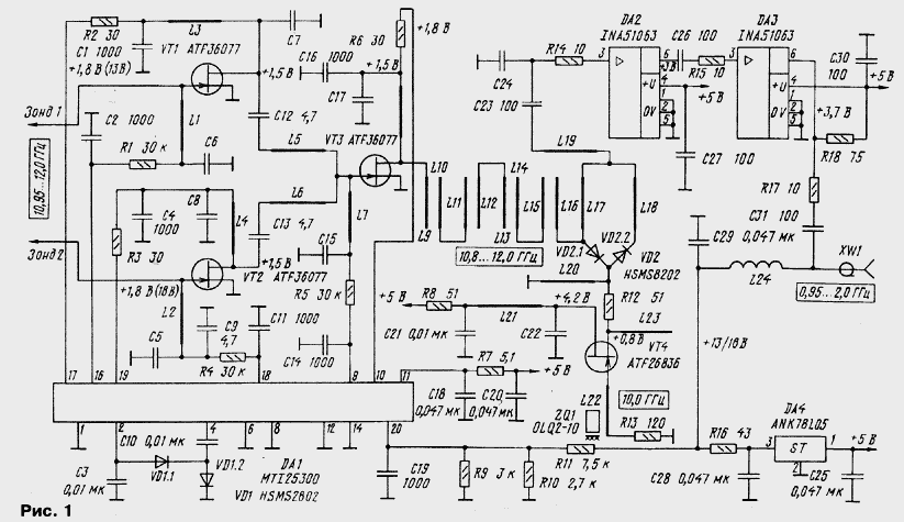 Конвертер построен по схеме малошумящего преобразователя частоты, конструкционно объединенным с облучателем антенной системы и встроенным переключателем поляризации входного сигнала. Его принципиальная схема приведена на рис. 1. Он состоит из входного волновода с погруженными в него зондами (на электрической схеме не показаны), СВЧ усилителя, выполненного на транзисторах VТ1 - VТЗ, полосового фильтра с использованием полосковых линий L9 - L18, гетеродина на частоту 10,0 ГГц на транзисторе VT4 со стабилизацией частоты, балансного смесителя на диодной сборке VD2, усилителя промежуточной частоты на микросхемах DA2 и DA3, стабилизатора напряжения на микросхеме DA4. В него входит также устройство на микросхеме DA1, выполняющее функции преобразователя напряжения +5 В в -2 В, переключатель поляризации и стабилизации токов полевых транзисторов VT1 - VT3. В конвертере применены микросхемы, транзисторы и диодные сборки производства фирмы Hewlett Packard (США). Входной сигнал, сфокусированный параболическим зеркалом, поступает в облучатель и от него - в круглый волновод диаметром 19 мм. Связь полосковых линий затворов транзисторов VT1 и VT2 с волноводом осуществляется с помощью погруженных зондов, установленных под углом 90 градусов в волноводе, что позволяет принимать сигналы как с вертикальной, так и с горизонтальной поляризацией. Переключение поляризации в конвертере осуществляется напряжением питания 13/18 В, поступающим по кабелю на выходной разъем XW1. Напряжение питания через делитель на резисторах R9 - R11 подается на вход компаратора микросхемы DA1. При напряжении питания 13 В микросхема DA1 включает транзистор VT1 и на его стоке появляется напряжение +1,5 В. Транзистор VT2 в это же время закрыт отрицательным напряжением -2 В, поступающим на его затвор, и, кроме того, напряжение со стока этого транзистора снято. При переключении напряжения питания на +18 В транзистор VT1 закрывается, а транзистор VT2 включается в нормальный режим работы. Это позволяет электронным способом менять вид поляризации принимаемого сигнала. Суммирование сигналов с транзисторов VT1 и VT2 осуществляется с помощью моста на полосковых линиях L5, L6. Суммарный сигнал поступает на затвор транзистора VT3 - второго усилительного каскада. Транзисторы VT1 - VT3 типа ATF36077 имеют коэффициент усиления 12 дБ на частоте 12 ГГц при напряжении питания +1,5 В и токе 10 мА. Таким образом, суммарный коэффициент усиления СВЧ усилителя составляет 24 дБ при коэффициенте шума порядка 0,5 дБ. Для достижения лучших значений коэффициента шума необходима точная настройка режима работы транзисторов и согласование их входов и выходов. Реально же удается получить коэффициент шума, отличный от паспортного на 0,1 дБ, поэтому в характеристиках приводится максимальное значение Кш на частоте 12 ГГц - 0,6 дБ. Усиленный СВЧ сигнал со стока транзистора VT3 поступает на вход полосового фильтра L9 - L18, выполненного на полосковых встречно-штыревых резонаторах и имеющего полосу пропускания 10,8... 12,0 ГГц при неравномерности АЧХ З дБ. С выхода фильтра сигнал СВЧ поступает на вход балансного смесителя, выполненного на диодной сборке VD2 СВЧ диодов с барьером Шоттки и полосковом мосте. На другой вход балансного смесителя поступает сигнал с частотой 10 ГГц с выхода гетеродина на транзисторе VT4. Гетеродин выполнен на полевом транзисторе по схеме с общим стоком, с отк