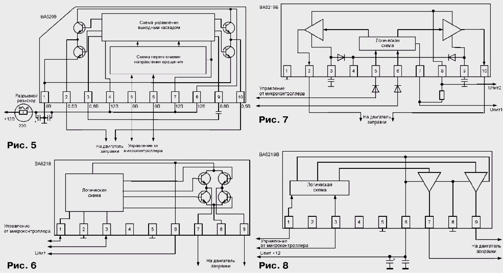 ЭНЦИКЛОПЕДИЯ РАДИОЭЛЕКТРОНИКИ И ЭЛЕКТРОТЕХНИКИ Ремонт видеомагнитофонов и видеоплейеров. ЛМП в аппаратах фирмы SHARP. Энциклопедия радиоэлектроники и электротехники Энциклопедия радиоэлектроники и электротехники / Телевидение Видеомагнитофоны (видеоплейеры) фирмы SHARP ранних выпусков с асимметричным расположением кассетоприемника часто выходят из строя из-за неисправности элементов ЛПМ. Дефекты, рассмотренные ниже, у большинства аппаратов (таких, как VC-6V3 и др.) проявляются уже через два-три года в зависимости от интенсивности эксплуатации. Это вызвано, как показала практика, конструктивными недоработками ЛПМ, а также несоблюдением правил пользования. Внешний вид узлов ЛПМ видеоплейера SHARP-VC-6V3 с разных сторон показан на рис. 1-4. В перечне наиболее часто встречающихся неисправностей не указаны случаи, связанные с дефектами самих ЛПМ и БВГ, которые влияют на качество записи и воспроизведения, так как о них довольно подробно рассказано в технической литературе, и они присущи всем типам подобных аппаратов. Здесь будут описаны неисправности кассетоприемника, программных переключателя и планки узла промежуточной шестерни. 1. Кассета не заправляется, двигатель заправки не вращается начале проверяют источник питания. Для этого вольтметром измеряют (если это возможно) его выходные напряжения на соединителе (рис. 1, поз. 1). Затем проверяют микросхему управления двигателем заправки. Найти ее легко - она установлена перпендикулярно к печатной плате и имеет 9 или 10 выводов. Выводы питания двигателя заправки соединены непосредственно с ее выводами. Микросхема управления может быть BA6209, BA6218, BA6219B или BA6418. Их структурные схемы изображены на рис. 5-8 соответственно. Убеждаются в поступлении питающего напряжения на микросхему от источника питания. Оно обычно равно 12 В. Если питающего напряжения на выводах микросхемы нет, проверяют исправность элементов, включенных между источником питания и микросхемой (например, блокировочные конденсаторы и разрывные резисторы на рис. 5). Бывает, что питающее напряжение на микросхему управления приходит, а двигатель заправки все же не включается. Тогда проверяют сам двигатель (см. рис. 1, поз. 4). Для этого отключают (если это возможно) разъем, который подключен к узлу программного механизма (см. рис. 1, поз. 3), или отпаивают провода питания двигателя заправки. От внешнего источника питания подают напряжение 12 В в любой полярности на выводы двигателя. Вращение последнего свидетельствует о его исправности. Следует также убедиться в наличии питающих напряжений на выводах микроконтроллера аппарата (обычно +5 В). Далее проверяют целостность проводников от микроконтроллера к микросхеме управления двигателем заправки (см. рис. 5-8). Затем контролируют правильность срабатывания механического датчика заправки видеокассеты, расположенного на плате датчиков кассетоприемника (см. рис. 1, поз. 8). В исходном состоянии его контакты должны быть замкнуты. При вставлении видеокассеты они размыкаются. Для того чтобы иметь доступ к датчику, снимают переднюю панель аппарата (она закреплена на пластмассовых защелках), отключают гибкий шлейф от платы датчиков (см. рис. 1, поз. 7), вывинчивают два винта крепления кассетоприемника к станине ЛПМ (часто эти винты закрашены красной краской) и снимают пассик (см. рис. 1, поз. 5) с двигателя з