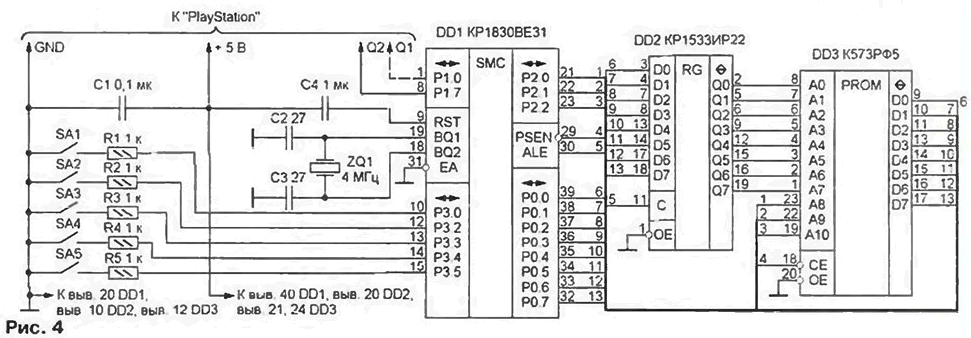 ЭНЦИКЛОПЕДИЯ РАДИОЭЛЕКТРОНИКИ И ЭЛЕКТРОТЕХНИКИ SONY PLAYSTATION - ремонт блока адаптации. Энциклопедия радиоэлектроники и электротехники Энциклопедия радиоэлектроники и электротехники / Телевидение Игровые видеоприставки "Sony PlayStation" популярны во всем мире. Те из них, с которыми чаще всего приходится иметь дело в России и других странах СНГ, обычно имеют блоки адаптации (продавцы нередко называют их "чип-универсал", "чип-декодер" или просто "чип"). Им оснащают видеоприставки перед продажей в странах, откуда они поступают к нам на продажу. Автор делится с читателями секретами этого блока, которые ему удалось разгадать, и опытом его ремонта. Блок адаптации [1] нужен для работы "Sony PlayStation" с игровыми CD южноазиатского производства, а также с содержащими русифицированные версии игровых программ. Фирмы, занимающиеся адаптацией, не спешат расставаться с "ноу-хау", приносящим им немалые доходы. Но тем не менее, если блок адаптации выходит из строя (а такие случаи известны), то отремонтировать его можно и своими силами. Различают несколько поколений этих игровых видеоприставок: "единички" SCPH- 1ххх (1995 г.). "тройки" SCPH-Зххх (1996 г.), "пятерки" SCPH-5xxx (1997 г.). "семерки" SCPH-7xxx (1998 г.) и. наконец, "девятки" SCPH-9xxx (1999 г.). По мере возрастания номера модели улучшаются ее энергетические, технологические, надежностные и экономические показатели при сохранении программной и аппаратной совместимости. На рис. 1, а-д приведены типичные схемы блоков адаптации различных видеоприставок. Позиционные обозначения микросхем, отсутствующие на печатной плате, отмечены апострофом. Бросается в глаза неповторяемость точек подключения блоков к процессорным платам и разнообразие типов микросхем. В качестве микросхемы 1С80Г используют в основном восьмиразрядные микроконтроллеры с внутренним ПЗУ PIC12C508/P. PIC16C54A-041I/P фирмы Microchip Technology, Z86E0208PSC фирмы Zilog или их бескорпусные аналоги. Последние после установки на плату залиты каплей компаунда. Жесткой связи между типом микроконтроллера и моделью "PlayStation" не существует. Например, в приставках SCPH-5502 можно встретить и PIC, и Z86, и бескорпусные контроллеры. Блоки адаптации одних моделей приставки могут не подходить к другим (сравните схемы на рис. 1, а, б, д). Приступая к исследованию блока адаптации по методике, изложенной в [2]. прежде всего необходимо определить, какой из выводов микросхемы IC801 служит входом, а какой - выходом. Заранее это неизвестно, так как задается программой, находящейся во внутреннем ПЗУ микроконтроллера. Чтобы установить истину, следует изучить осциллограммы всех сигналов, поочередно отпаивая выводы от контактных площадок. Чтобы измерения были корректными (если выход - с открытым стоком), отпаянный вывод следует соединить с источником питания через резистор 100 кОм. Еще один стандартный прием - проверка реакции на нажатие кнопки "RESET" игровой приставки. Сигнал, который на сброс не реагирует, с большой вероятностью - выходной, и наоборот В результате было выяснено, что устройства, схемы которых показаны на рис. 1, а. п имеют по одному входу тактовой частоты (3,98 или 4,23 МГц) и по два выхода. В блоке по схеме рис. 1, в тактовую частоту 4.433 МГц задает кварцевый резонатор ZQ1. Выходной сигнал PCLK синхронизирует кодер RGB-PAL IC501. Устройство, схема которого приведена на рис. 1. д, содержит два независимых канала: первый - со входом А и выходом В. второй - только