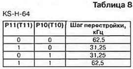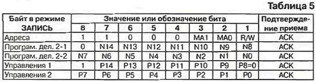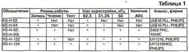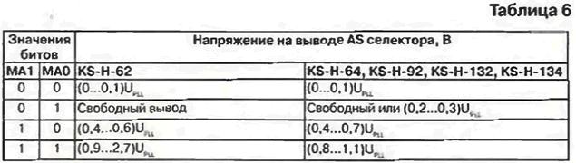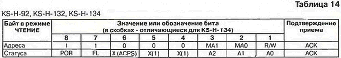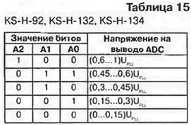 В режиме ЧТЕНИЕ протокол обмена состоит из байга адреса и байта статуса. Бит R/w в байте адреса должен быть равен 1. Других изменений в этом байте нет (см. табл. 5, 14). Байт статуса для селекторов KS-H-92. KS-H-132. KS-H-134 представлен в табл. 14. Бит POR (Power On Reset) сигнализирует о включении питания селектора. Бит POR равен 1, когда питание подано. Бит FL (In lock Flag) - сигнал о действии системы ФАПЧ. Когда бит FL равен 1. кольцо системы ФАПЧ замкнуто. Бит ACPS (Automatic Charge Pump Switch flag) информирует о работе устройства автоматического переключения НАКАЧКИ в селекторе KS-H-134. Бит ACPS активен в состоянии 0. Биты А0-А2 - выходные сигналы пятишагового АЦП (ADC). Для селекторов с режимом ЧТЕНИЕ (см. табл. 14) параметры ADC и комбинации уровней А0-А2 одинаковы и указаны в табл. 15. АЦП позволяет, например, управлять селектором по трехпроводной шине (американский стандарт). Еще несколько слов о процессорах управления. Их довольно много. Отличаются они один от другого заполнением внутреннего ПЗУ ("прошивкой"). Для селекторов KS-H-92. KS-H-132 лучше всех подходит процессор РСА84С640-30 фирмы PHIUPS. Литература