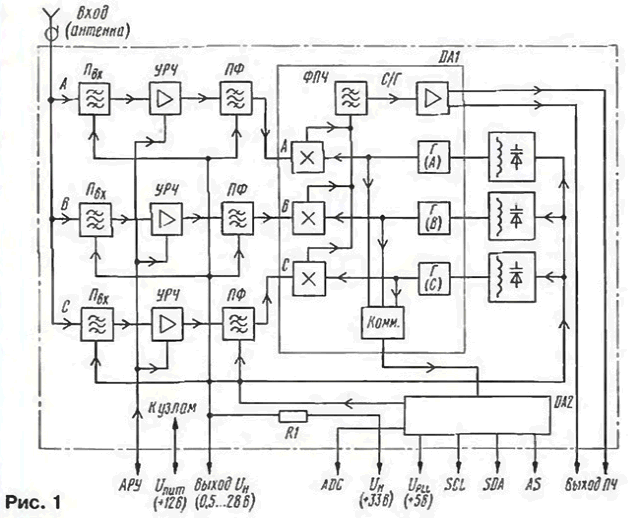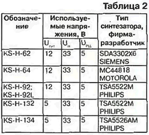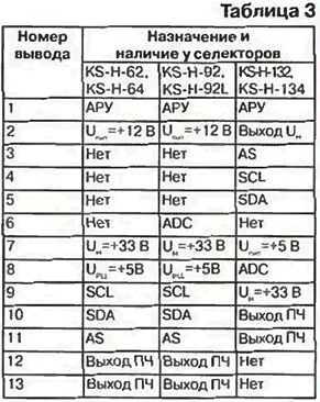 ЭНЦИКЛОПЕДИЯ РАДИОЭЛЕКТРОНИКИ И ЭЛЕКТРОТЕХНИКИ Современные селекторы ТВ каналов с синтезом частоты. Энциклопедия радиоэлектроники и электротехники Энциклопедия радиоэлектроники и электротехники / Телевидение Селекторы, принцип действия которых основан на синтезе частоты, называют селекторами PLL ("Phase Locked Loop", что в переводе с английского означает "замкнутая петля ФАПЧ"). Эти селекторы называют еще цифровыми, так как управляются они процессором телевизора по двухпроводной двунаправленной цифровой шине I2С. Синтез частоты существенно повышает точность настройки на телестанцию, упрощает пользование телевизором, сохраняя возможность ручной подстройки для получения оптимального качества изображения [1 - 4]. Прежде чем перейти к описанию селекторов, поясним некоторые термины и условные обозначения, принятые для селекторов PLL. Поток информации по цифровой шине I2С может передаваться в двух направлениях: от процессора и к процессору. Когда он направлен от процессора к селектору (например, команды установки), такой режим называют ЗАПИСЬ. Обратная передача потока информации (от селектора) соответствует режиму ЧТЕНИЕ, который устанавливается, когда селектор в некоторый момент сообщает процессору о своем состоянии или подтверждает ранее установленное (по запросу процессора). Этот режим имеют не все селекторы PLL. Далее используются обозначения: AS (Adress Select) - шина адреса: SDA - последовательная шина данных; SCL (Select Clock) - шина синхронизации, тактовых импульсов; LW - напряжение питания синтезатора (+5 В); ADC - пятиуровневый АЦП, встроенный в синтезатор и позволяющий управлять каким-нибудь дополнительным устройством через селектор. В табл. 1 - 3 указаны наиболее важные сведения о селекторах PLL производства АО "SELTEKA" (г. Каунас. Литва) [5] и их аналоги - доступные современные селекторы зарубежных фирм (отечественные модели, к сожалению, до сих пор не внедрены в серийное производство). Другие общие сведения о них и параметры были опубликованы в [1]. Напомним, что все они - всеволновые модели европейской унификации. Антенный вход - типа IEC (SNIR), выход ПЧ - симметричный. В табл. 2 и 3 Uн - напряжение настройки; вывод 1 - ближайший к антенному входу. У селекторов KS-H-132. KS-H-134 имеется только 11 выводов. В этих селекторах напряжение питания равно +5 В и специальный вывод для напряжения UPLL не предусмотрен, но имеется вывод для напряжения настройки (0,5...28 В) - выход UH который облегчает контроль работы селекторов и делает возможным ручную подстройку.