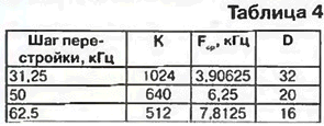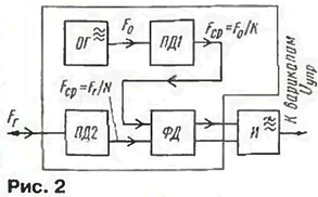 Наиболее простая модель - KS-Н-62. Скорость перестройки, начиная с частоты 132 МГц в поддиапазоне А, 356 МГц в поддиапазоне В и 678 МГц в поддиапазоне С, изменяется (программно) так. чтобы скомпенсировать нелинейность зависимости емкости варикапов от напряжения настройки. В селекторе KS-H-64 скорость перестройки изменяется также программно. Сама программа "зашита" в процессоре. KS-H-92 - более совершенный и сложный селектор. Скорость перестройки замедляется (slightly - слегка) вблизи телестанции для уменьшения остаточной расстройки. В таблицах даны параметры модернизированного (в конце 1998 г.) варианта селектора KS-H-92, в котором установлена микросхема TSA5522M фирмы PHILIPS вместо синтезатора фирмы MOTOROLA. Этот вариант стал аналогом селектора 3402РНС фирмы ТЕМIС. Селектор KS-H-92L - вариант KS-H-92 с удлиненным антенным входом (32.2 мм). Аналогичными функциональными возможностями обладает селектор KS-H-132, но при низком напряжении питания. Самым новым селектором на сегодняшний день можно назвать KS-H-134 (разработка 1998 г.). В нем изменены границы поддиапазонов принимаемых частот: А - с эфирного канала 1 по кабельный канал СК6 (47... 158 МГц). В - с СК7 no СК37 (158...438 МГц); С - с СК38 по 69-й канал (438...862 МГц). Введен режим тестирования, а изменение скорости перестройки происходит автоматически. При замыкании петли системы ФАПЧ (в полосе захвата канала) обеспечивается переключение скорости перестройки, а при отсутствии фиксации - обратное изменение скорости. Программное включение/выключение функции скорости перестройки позволяет перейти на ручную настройку. На рис. 1 представлена структурная схема селектора PLL (на примере KS-H-92). Он состоит из трех одинаковых каналов выделения, усиления и преобразования сигнала. Каждый канал рассчитан для работы только в одном поддиапазоне (А, В или С). Рассмотрим построение одного из каналов, например, для поддиапазона А. Радиосигнал с антенного входа выделяется входным контуром, выполняющим роль полосового фильтра (Пм). и проходит на усилитель радиочастоты (УРЧ). собранный на полевом транзисторе. Нагрузкой УРЧ служит полосовой фильтр (ПФ). Входной контур и полосовой фильтр перестраиваются варикапами. Усиленный сигнал поступает на микросхему DA1, содержащую три отдельных балансных смесителя-гетеродина (С/Г). Контуры гетеродинов также перестраиваются варикапами. Сигнал ПЧ выделяется полосовым фильтром (ФПЧ) и после согласующего каскада приходит на выходные выводы селектора (выход ПЧ). Сигнал гетеродина через коммутатор (Комм) поступает на микросхему синтезатора частоты DA2. На рис. 2 показан фрагмент структурной схемы синтезатора, в который входит образцовый генератор (ОГ) частоты Fo, первый программируемый делитель (ПД1) с коэффициентом деления К и второй программируемый делитель (ПД2) с коэффициентом деления N, частотно-фазовый детектор (ФД) и активный фильтр нижних частот, в качестве которого применен интегратор (И). Последний не входит в состав микросхемы, однако он работает в петле системы ФАПЧ и peaлизует изменение скорости перестройки. Частота образцового сигнала стабилизирована кварцевым резонатором на 4 МГц. Делитель ПД1 выполнен так, что его коэффициент деления К задается процессором в строгом соответствии с установленным шагом перестройки по табл. 4. Как работает синтезатор в кольце импульсной системы ФАПЧ при переходе частоты гетеродина с Fг1 на часто