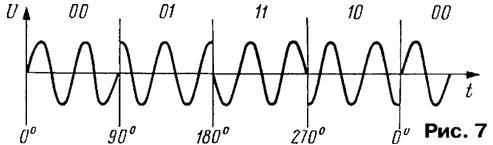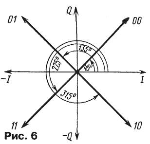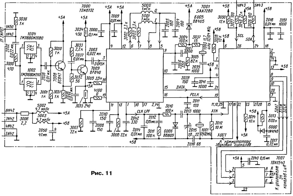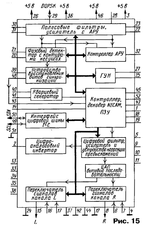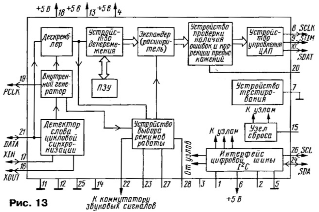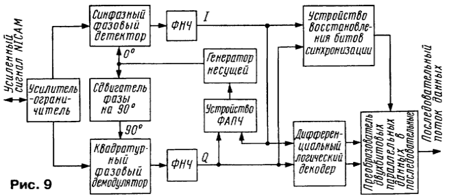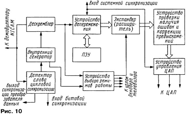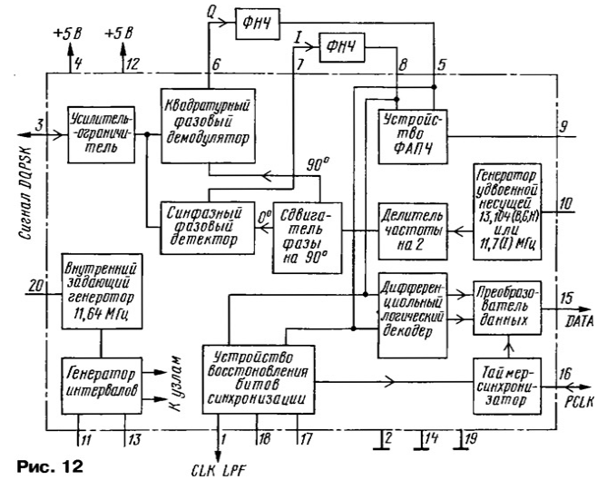 Следовательно, представленные битовые комбинации изменяют фазу несущей на различные углы по отношению к фазе предыдущего сигнала, как это показано на временной диаграмме рис. 7. Для обеспечения такой манипуляции фазы предусмотрено преобразование последовательного потока цифровых звукоданных в параллельный двухбитовый формат. В результате битовая скорость передачи снижается в два раза, что приводит к сужению полосы частот, занимаемых сигналом. Модулированный сигнал DQPSK и частотно-модулированный сигнал монозвука поступают на преобразователь частоты, где они переносятся на заданную несущую частоту. ВЧ сигнал усиливается и излучается антенной. Рассмотрим фрагмент структурной схемы телевизора со встроенными демодулятором и декодером NICAM (рис. 8). Как и обычно, сигнал вещательного телевидения поступает на антенный вход селектора каналов (тюнера), в котором происходят выбор и преобразование принятых радиочастотных сигналов в сигналы ПЧ изображения и звука. Усиленные и прошедшие фильтр на ПАВ они проходят в соответствующие тракты обработки телевизора. Полосовой фильтр NICAM (на частоту 5,85 МГц для стандартов В, G, Н, D, К или 6,552 МГц для стандарта I) выделяет сигналы ПЧ NICAM, которые после усиления поступают на демодулятор NICAM (рис. 9). Его работа основана на тех же принципах, что и обычного демодулятора ЧМ сигналов, в котором изменения фазы или частоты колебаний приводят к изменению выходного постоянного напряжения. Однако при квадратурной модуляции помимо синфазного фазового детектора используется еще и квадратурный фазовый демодулятор, на который подают сдвинутый по фазе на 90° сигнал с генератора несущей. С выходов детектора и демодулятора через ФНЧ сигналы данных I и Q приходят на дифференциальный логический декодер, устройство восстановления битов синхронизации и устройство ФАПЧ. Последнее, как обычно, при необходимости вырабатывает сигнал ошибки, который подстраивает частоту и фазу генератора несущей. Устройство восстановления битов синхронизации входит во вторую петлю ФАПЧ, синхронизированную со скоростью передачи битов. Для обеспечения синхронизации битовой скорости в качестве системной используется частота, кратная битовой скорости. Битовая скорость передачи получается делением системной частоты синхронизации на 8. Дифференциальный логический декодер преобразует потоки данных I и Q в соответствующие двухбитовые параллельные данные, которые затем проходят на параллельно-последовательный преобразователь, восстанавливающий исходный последовательный поток данных. В декодере NICAM (рис. 10) обеспечивается дескремблирование, деперемежение, экспандирование данных, восстановление исходных 14-битовых слов и управление ЦАП. Закодированные данные с демодулятора NICAM поступают на детектор слова цикловой синхронизации и на дескремблер для распознавания цикла и дескремблирования. Дескремблированные данные приходят на устройство деперемежения, на выходе которого воспроизводятся исходные двухканальные (L и R) данные вместе с сигналом опознавания нужного канала. Для деперемежения, по аналогии с передатчиком, сначала выполняется запись в ячейки ПЗУ потока данных блок за блоком а затем для воспроизведения правильного порядка следования битов содержимое ячеек считывается в соответствии с записанной в ПЗУ программой. Дес