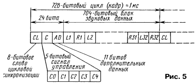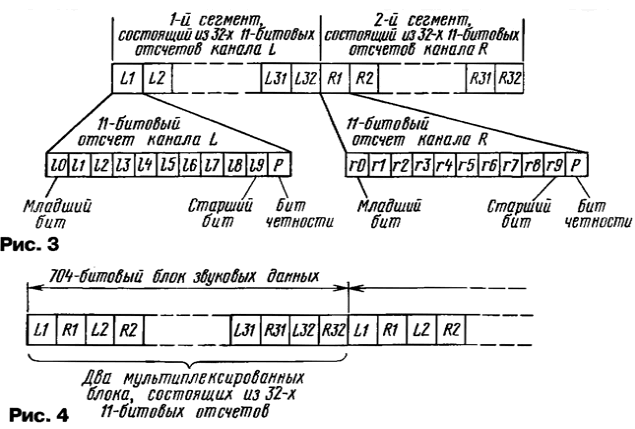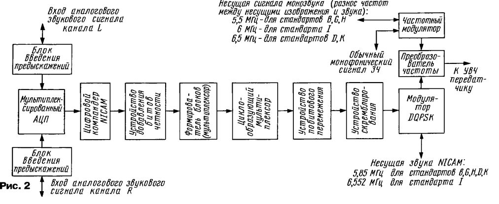 Так как "Первый канал" телевизионного вещания начал вести стереофоническое звуковое сопровождение ряда своих передач именно по этой системе, следует ознакомить читателя с принципами формирования сигнала NICAM, его передачи и приема по радиочастотным стандартам В, G, Н, I, а также с конкретными схемами декодеров сигнала телевизионных приемников. Поскольку в системе обеспечивается передача с суммарной скоростью 728 кбит/с, то в литературе ее чаще называют NICAM-728 [1- 4]. В соответствии с Рекомендацией 707 МККР систему применяют в тех случаях, когда в наземные телевизионные устройства совместно с передачей аналогового видеосигнала дополнительно требуется ввести цифровой звук. Для его передачи используют две несущие частоты (рис. 1), основная из которых f3 ocн модулируется, как обычно, по частоте аналоговым монофоническим сигналом звукового сопровождения телевизионных программ, а дополнительная f3 доп - цифровым стереофоническим сигналом звука NICAM. Значения несущих звука отстоят от несущих изображения fиз на 5,5 (основная) и 5,85 (дополнительная) МГц для стандартов В, G, Н и на 6 и 6,552 МГц для стандарта I. На этой одной несущей NICAM обеспечивается передача двух высококачественных звуковых сигналов каналов L (левый) и R (правый). Несущая звука NICAM в стандартах В, G, Н, I расположена по частоте чуть выше несущей обычного звука, но в пределах полосы частот радиоканала. Основные параметры системы NICAM указаны в таблице. Принцип формирования сигнала системы NICAM рассмотрим по упрощенной структурной схеме передатчика, показанной на рис. 2. Перед подачей из каналов L и R аналоговых звуковых сигналов на мультиплексированный АЦП в каждый из них вводят предыскажения. Они необходимы в соответствии с международными стандартами (Рекомендация J.17 МККТТ), чтобы обеспечить некоторый подъем ВЧ составляющих сигналов. Предыскажения позволяют уменьшить уровень шумов, которые расположены преимущественно в этом интервале. В приемнике соотношение НЧ и ВЧ составляющих восстанавливается цепями коррекции предыскажений, уменьшающими амплитуду ВЧ составляющих. Известно, что для получения высокого качества звучания домашней аппаратуры вполне достаточно полосы звуковых частот 15 кГц. Отсюда следует, что мини мальная частота дискретизации (выборки) при преобразовании аналогового зву кового сигнала в цифровой должна быть равна удвоенному значению верхней звуковой частоты, т. е. 30 кГц. Однако на практике для предотвращения наложения спектров сигналов и связанных с этим искажений используют чуть более высокую частоту выборки - 32 кГц. Выборка в сигналах L и R происходит одновременно, после чего в АЦП группа из трех отсчетов сигнала L преобразуется в 14-битовое кодированное слово, вслед за которым следует такая же группа отсчетов сигнала R, затем опять слово L и т. д. поочередно. Выходной сигнал АЦП состоит из последовательно следующих сегментов данных, представляющих собой группы из 32 отсчетов каждого канала. 14 битовая оцифровка сигналов позволяет получить большое число уровней квантования (16384), что вполне приемлемо для высококачественного воспроизведения звука. При упомянутых условиях оцифровки сигналов с частотой выборки 32 кГц требуется довольно большая скорость передачи данных и, следовательно, очень широкая полоса частот, которая никак не вписывается в полосу частот радиокан