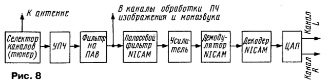 ЭНЦИКЛОПЕДИЯ РАДИОЭЛЕКТРОНИКИ И ЭЛЕКТРОТЕХНИКИ Принимаем стереофоническое звуковое сопровождение. Энциклопедия радиоэлектроники и электротехники Энциклопедия радиоэлектроники и электротехники / Телевидение С 14 ноября 2003 г. "Первый канал" российского телевидения начал регулярно передавать ряд программ со стереофоническим звуковым сопровождением. Они отмечены на изображении специальным значком в виде наложенных со смещением один на другой двух стилизованных экранов телевизоров. Конечно, сохранилась и передача монофонического звукового сигнала. Такое вещание стало возможным в связи с вводом на Останкинской телебашне нового передатчика взамен старого, работавшего с 1967г. - со дня начала вещания из телецентра в Останкине. Старый передатчик пока будут использовать в качестве резервного. Жители Москвы и Подмосковья могут принимать стереозвук, если их телевизоры оснащены демодуляторами - декодерами сигнала NICAM, передаваемого способом фазовой модуляции DQPSK на поднесущей частоте 5,85 МГц. Напомним, что разнос между несущими частотами изображения и обычного монофонического звука в радиоканалах равен 6,5 МГц, как предусмотрено в используемых у нас стандартах D (на MB) и К (на ДМВ). О том, как формируется, передается и принимается сигнал стереофонического звукового сопровождения NICAM рассказано в этой и последующих частях публикуемого материала. До недавнего времени в нашей стране не велось стереофоническое звуковое сопровождение эфирных телевизионных программ, поэтому интерес к системам такого вещания был небольшой. В то же время за рубежом они успешно эксплуатируются. Одна из наиболее популярных среди них - система стереофонического звукового сопровождения телевизионного вещания NICAM (Near Instantaneously Companded Audio Multiplex - почти мгновенно компандированный звуковой сигнал с уплотнением). Она была разработана Британской радиовещательной компанией ВВС (Би-Би-Си) и впервые представлена в МККР в 1987 г. В эксплуатацию она вошла в 1988 г. и сейчас широко используется в Великобритании, Швеции, Дании и других странах Европы как в наземном, так и в спутниковом телевизионном вещании. Словарь терминов