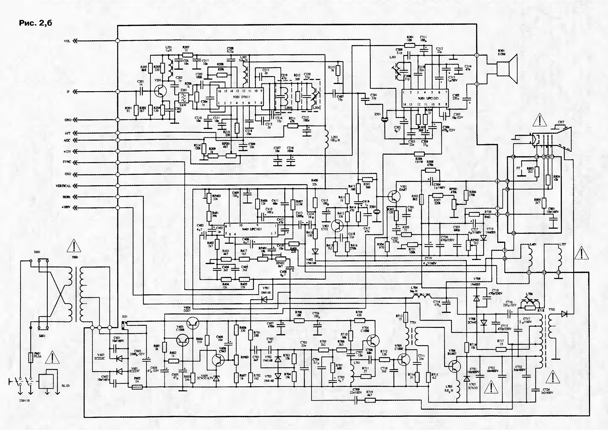 Чувствительность тракта изображения телевизора, ограниченная синхронизацией, в диапазоне метровых волн (MB) - не хуже (не более) 40 мкВ, а в диапазоне дециметровых волн (ДМВ) - не хуже (не более) 70 мкВ. Номинальная выходная мощность канала звукового сопровождения равна 1 Вт. Габариты (ширина х высота х глубина) телевизора - 330x255x385 мм. В комплект телевизора входят комнатная антенна и пульт дистанционного управления (ПДУ). ПДУ может управлять аппаратом на расстоянии до 5 м. Включают телевизор кнопкой, установленной на его лицевой панели. Причем нажатие на кнопку включения сети сразу вызывает рабочий режим аппарата. Кнопками "Р+" или "Р-" можно переключать программы, а кнопками "V+" и "V-" - регулировать громкость звукового сопровождения. ПДУ содержит ряд кнопок управления и настройки телевизора. Любой из цифровых кнопок переключают программы. Кнопками "Р+" и "Р-" ПДУ переключают программы последовательно по кольцу. Кнопки "V+" и "V-" обеспечивают регулировку громкости звука, а кнопкой со значком в виде перечеркнутой крестом динамической головки ее можно выключить и при повторном нажатии снова включить. Кнопка "Меню" вызывает операции настройки телевизора, а кнопкой "AC off" выключают его. Принципиальная схема телевизора представлена на рис. 2. В нем применен фотоприемник А101 инфракрасного (ИК) излучения с ПДУ. Принятый им сигнал через НЧ фильтр R108С137 поступает на вход (вывод 5) микросхемы N101, первой из пяти примененных в телевизоре микросхем фирмы NEC. Микросхема N101 как декодер команд управления представляет собой микропроцессор со специализированными портами. Каждый порт выполняет отдельную функцию управления телевизором, формируя соответствующие сигналы. Команда "AC off" приводит к появлению на выводе 27 микропроцессора импульса отрицательной полярности, который через резистор R140 открывает транзистор V110. При этом конденсатор С127 заряжается через эмиттерный переход транзистора V111, открывая его до насыщения. Коллекторный ток транзистора, протекающий через обмотку включенного в его цепь соленоида RL101, вызывает его срабатывание и выключение сетевого питания телевизора. С кнопок управления SW101 - SW105, расположенных на лицевой панели телевизора, команды поступают через выводы 12, 13, 15-17 микропроцессора на соответствующие порты. В результате обеспечивается переключение программ в прямом (по возрастанию номеров) кнопкой "Р+" и обратном кнопкой "Р-" порядке, управление громкостью звука для увеличения кнопкой "V+" или уменьшения кнопкой "V-" его уровня, а также управление настройкой телевизора кнопкой "Меню". Через вывод 24, фильтр НЧ R139С125 и цепь C124R138 сигнал, формирующий на экране графические изображения выполняемых команд (OSD), поступает на базу транзистора V501 видеоусилителя. Логические уровни с выводов 38- 40 микропроцессора через соответствующие НЧ фильтры R152C132, R153C131 и R154C130 управляют транзисторами V114-V116 соответственно. Через эти транзисторы необходимые напряжения для включения поддиапазонов поступают на соответствующие выводы селектора каналов. Для обеспечения синхронизации выводимой на экран информации на выводы 21 и 22 микропроцессора поданы строчные и кадровые импульсы соответственно, снимаемые с выходных каскадов разверток. Амплитуда и полярность строчных импульсов определяется элементами С122, R136, С123, R135 и каскадом на транзисторе V109, а амплитуда и полярн