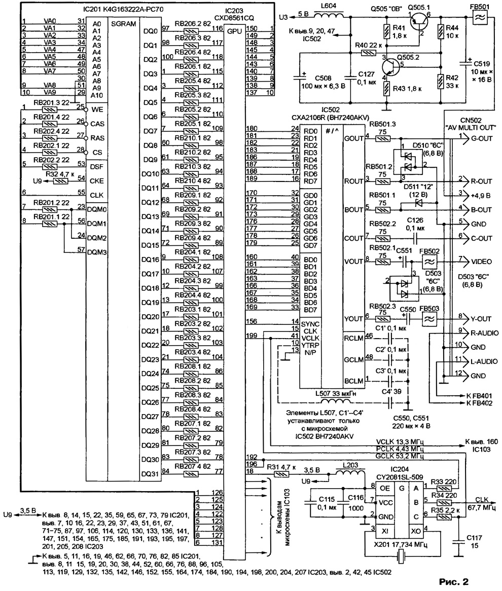 ЭНЦИКЛОПЕДИЯ РАДИОЭЛЕКТРОНИКИ И ЭЛЕКТРОТЕХНИКИ PS one: принципиальная схема. Энциклопедия радиоэлектроники и электротехники Энциклопедия радиоэлектроники и электротехники / Телевидение В комплект поставки "PS one", кроме системного блока (консоли), входят джойстик DUAL SHOCK, выносной сетевой адаптер и кабель для подключения к телевизору. Демонстрационный CD отсутствует. Кабель и джойстики всех моделей "PlayStation" унифицированы. Схемы находящейся в системном блоке процессорной платы и сетевого адаптера рассмотрены ниже. Это не официальные документы изготовителя ИВП, они - результат анализа печатных плат нескольких экземпляров приставки. Позиционные обозначения большинства элементов даны в соответствии с маркировкой на платах. К сожалению, установленные на процессорной плате чип-резисторы и керамические чип-конденсаторы не маркированы. Поэтому номера в их позиционных обозначениях "фирменным" не соответствуют. Номинальная мощность чип-резисторов определена по их типоразмерам: 1206 - 0,25 Вт; 0805 - 0,125 Вт; 0603 и 0402 -0,063 Вт. ПРОЦЕССОРНАЯ ПЛАТА Полная схема этой главной составной части видеоприставки условно разбита на несколько. Рис. 1 содержит узлы вычислительной системы ИВП, в основе которой 208-выводная СБИС 1С 103 CXD8606CQ. Кроме 32-разрядного процессорного RISC-ядра, совместимого с R3000A фирмы MIPS, она содержит память программ (4 Кбайт), память данных (1 Кбайт), блок регистров общего назначения, графический ускоритель GTE (Graphic Transfer Engine), контроллеры прямого доступа к памяти, прерываний, внешнего динамического ОЗУ и кэш-памяти, три 16-разрядных счетчика-таймера, два последовательных порта ввода-вывода, JPEG-декодер. Процессор тактирован сигналом CLK. На вывод 76 ЦП через цепь R25C115 поступает сигнал RES, устанавливающий систему в начальное состояние. Включенные последовательно в цепи некоторых выводов СБИС низкоомные резисторы служат для устранения "звона" на перепадах импульсов. Высокоскоростной 32-разрядной шиной данных CD0-CD31 и шиной адреса CA0-СА9 ЦП связан с динамическим ОЗУ IC106 K4Q153212M-JC60 объемом 2 Мбайт. Ранее эту микросхему выпускали под названием KM432V515. Восьмиразрядное масочное ПЗУ IC102 M53403IE-47 - заказное. Последние две цифры (47) названия - номер версии "прошивки" ПЗУ. В официальной спецификации параметров "PS one" фигурирует его объем 512 Кбайт. Однако 20-разрядная шина адреса АО-А19 позволяет обращаться к вдвое большему числу ячеек. Микросхемы ПЗУ, установленные в разных 32-разрядных моделях "PlayStation", взаимозаменяемы. Этим обстоятельством пользуются при ремонте. Разъемы CN101.1, CN101.2, CN102.1, CN102.2 предназначены для подключения к ИВП джойстиков и карт памяти. Все их входные и выходные цепи защищены от помех и повреждений фильтрами FB117-FB123, стабилитронами и их сборками D101, D103, D104, а также RC-цепями. Штриховыми линиями на рис. 1 изображена микросхема IC801 PIC12C508A. Это так называемый "mod-chip" - микроконтроллер, запрограммированный таким образом, что обеспечивает запуск игровых CD как фирменного (с темно-фиолетовой поверхностью), так и нефирменного (с серебристой поверхностью) производства разной региональной принадлежности. Место на печатной плате этой микросхеме не предусмотрено, она бывает подключена навесными проводами. В качестве IC801 применяют микроконтроллеры самых разных серий (PIC, AT90S, Z86), зачастую со стертыми названиями и обрезанными "лишними" выводами. Однако те, что предназначены для пр