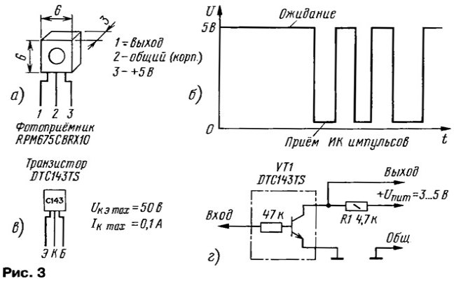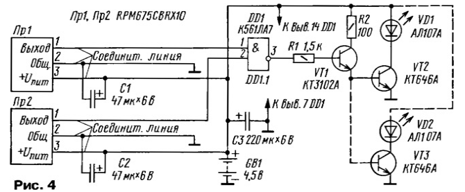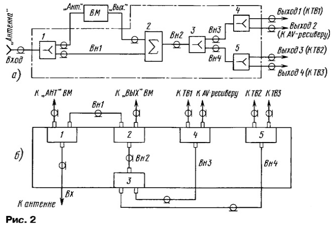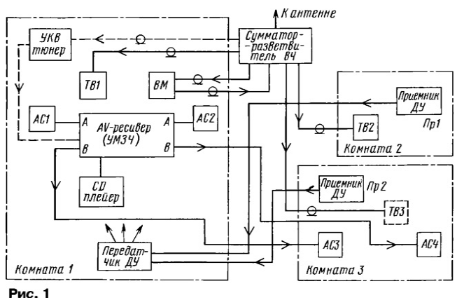 ЭНЦИКЛОПЕДИЯ РАДИОЭЛЕКТРОНИКИ И ЭЛЕКТРОТЕХНИКИ Многокомнатная видеоаудиосистема. Энциклопедия радиоэлектроники и электротехники Энциклопедия радиоэлектроники и электротехники / Телевидение Разногласий в семье при пользовании одним видеоаудио-комплексом (видеомагнитофон, телевизор, CD-плейер, AV-pe-сивер и др.) можно избежать, если оборудовать квартиру радиочастотной распределительной сетью и системой дистанционного управления. Дополнительно, как минимум, потребуются еще один телевизор и акустическая система. Как это сделать и рассказано в публикуемой статье. В последние годы за рубежом нашли распространение так называемые многокомнатные системы (MULTI-ROOM), обеспечивающие работу одного комплекта видеоаудиотехники на несколько жилых помещений. Например, имея в одной комнате телевизор (ТВ), видеомагнитофон (ВМ), AV-ресивер и проигрыватель компакт-дисков (CD-плейер), можно получить возможность просмотра футбольного матча главой семьи в этой комнате, фильма с взятой на прокат видеокассеты хозяйкой дома на кухне и прослушивание компакт-дисков молодежью в детской комнате. И все это одновременно. Необходимые требования для обеспечения комплекса - наличие второго ТВ на кухне (можно еще в детской третьего ТВ) и простой акустической системы (АС) в детской комнате. О том, как организовать простой многокомнатный комплекс и пойдет речь. Один из вариантов размещения его компонентов показан на рис. 1. Комплекс состоит из системы распределения аудио- и видеосигналов и устройства дистанционного управления (ДУ). Наиболее просто реализуется подача звуковых сигналов от AV-ресивера (или УМЗЧ) на АС в комнате 3. Соединительным кабелем может служить обычный провод, используемый для электропроводки, с сечением жилы не менее 0,75 мм2 (разговор, конечно, не идет о системах Hi-Fi). Перед прокладкой провода необходимо пометить одну из жил каким-нибудь значком, например, "+", на обоих концах, потом сделать это будет затруднительно. Подключать колонки АС нужно обязательно с соблюдением полярности, иначе исказится стереопанорама. В тех случаях, когда AV-ресивер (или УМЗЧ) не имеет выходов "В" для второй пары колонок, потребуется установка внешнего переключателя, в качестве которого можно применить тумблеры для сильноточных (более 6 А) цепей. В них используют надежные контакты с серебряным покрытием. ТВ в комнатах 2 и 3 подключают по высокой частоте коаксиальным телевизионным кабелем. При его приобретении нужно обратить внимание на качество оплетки. Она должна быть плотной, без просветов, с медными, можно лужеными, проводниками. Схема соединений показана на рис. 2 а размещение ВЧ элементов - на рис. 2,б. Для реализации такой сети потребуются широкополосные разветвители 1, 3-5 и сумматор 2. Их можно купить на любом радиорынке или в магазинах, торгующих радиодеталями. Выполнены они на ферритовых кольцах и обладают малыми потерями. Конструктивно они собраны чаще всего в коробке с тремя стандартными телевизионными гнездами. При покупке необходимо выбирать изделия широкополосного (MB - ДМВ) исполнения. Самостоятельно потребуется изготовить четыре кабеля внутренних соединений (Вн), т. е. припаять штекеры к отрезкам кабеля необходимой длины. В продаже бывают такие же разветвители с отрезком кабеля и штекером на входе, которые можно использовать на позициях 3-5. В этом случае ну