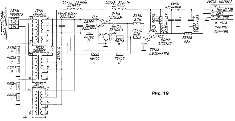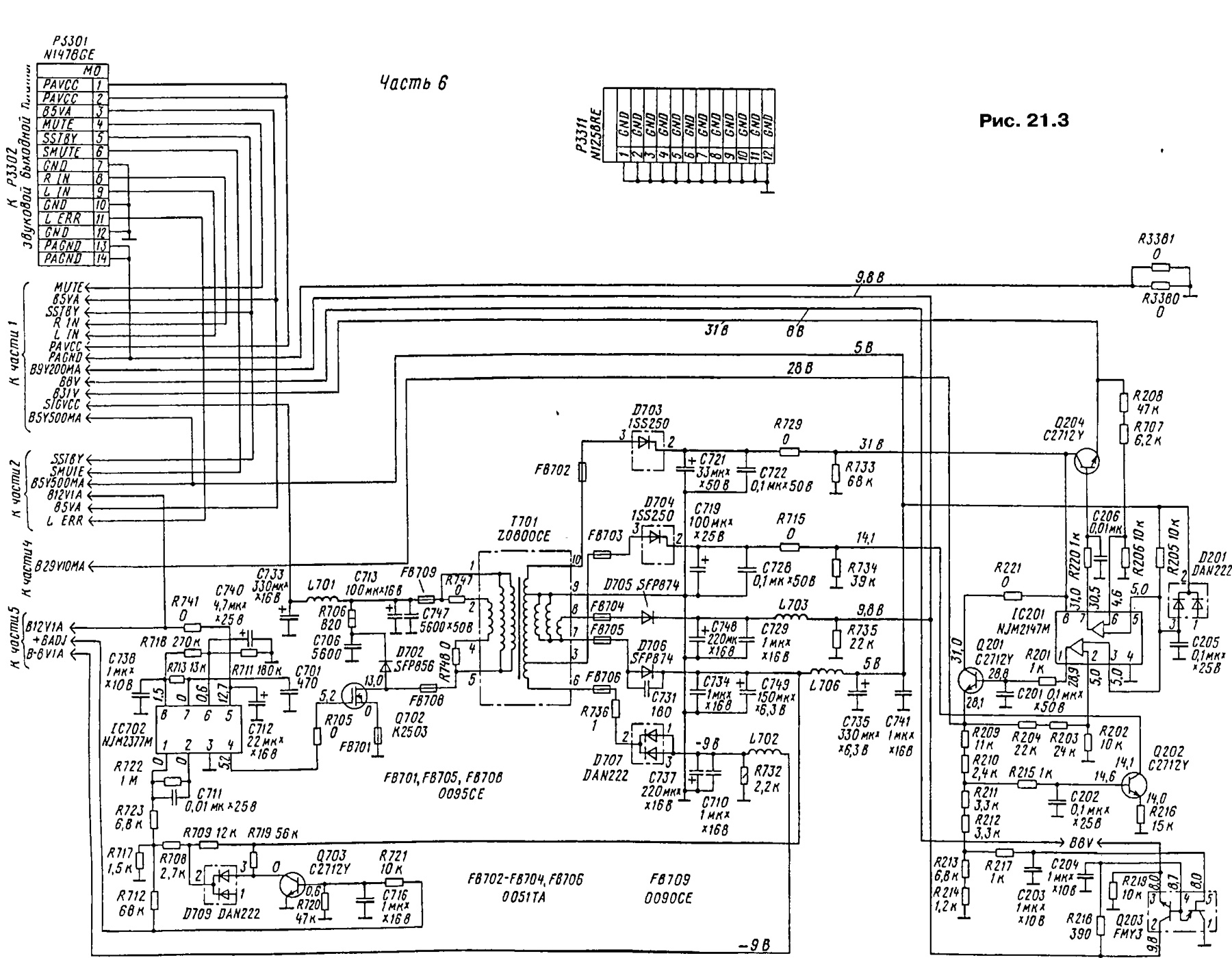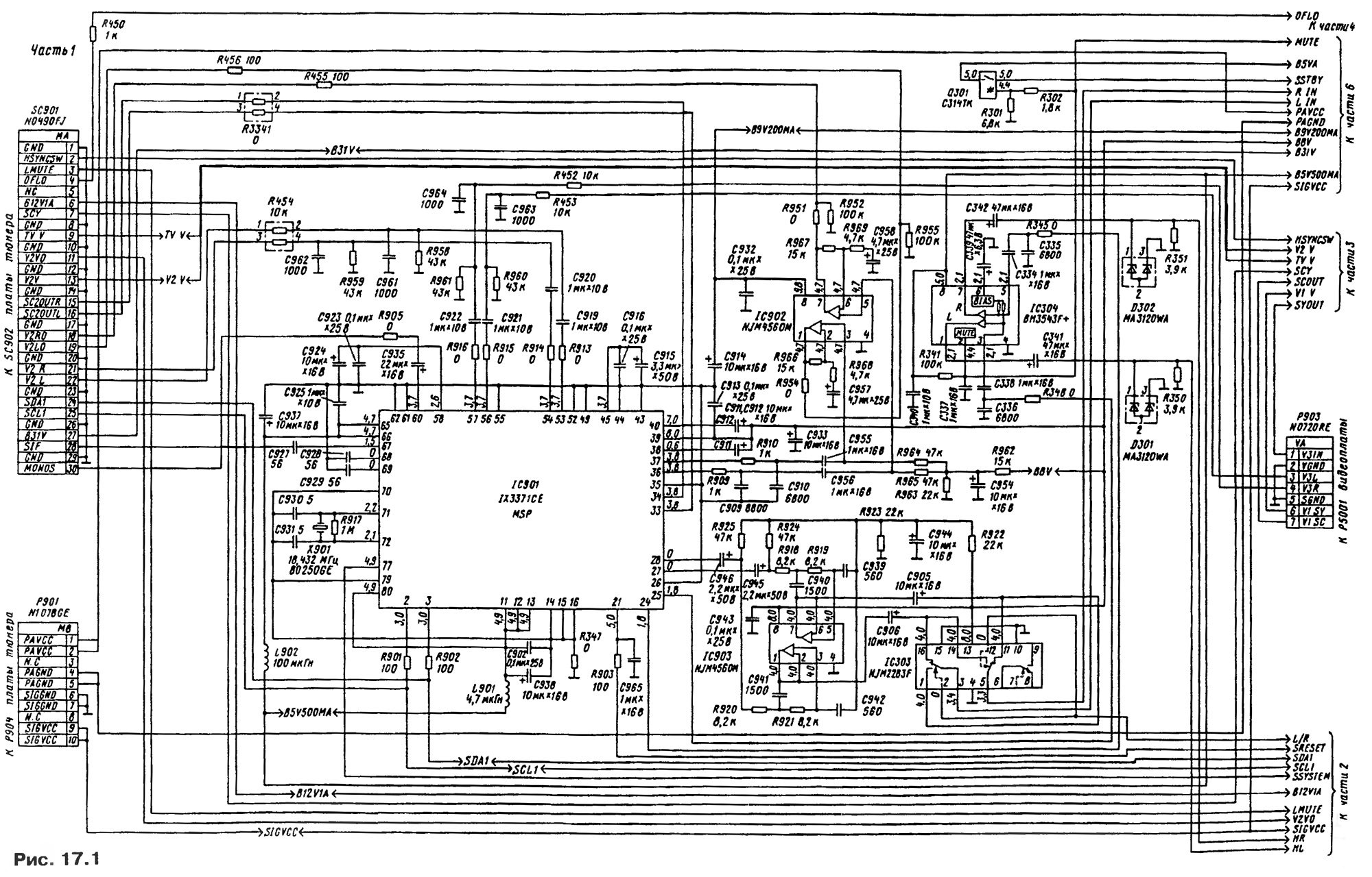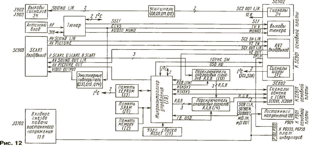Значения устанавливают теми же кнопками VOLUME+ и VOLUME- на ПДУ. При ремонте таких телевизоров необходимо соблюдать не меньшую осторожность, чем при ремонте обычных телевизоров. Весьма желательно работать в антистатическом браслете и на электропроводящем коврике, так как все панели "боятся" электростатических зарядов. Прежде чем приступить к ремонту, необходимо убедиться в правильности установки параметров так, как это описано выше. Для ориентирования при ремонте на рис. 25 представлено размещение плат и других устройств в телевизоре, а также расположение разъемов. Широкими черными стрелками на нем показаны направления поиска разъемов для облегчения снятия и установки плат. Рассмотрим возможные неисправности телевизора на конкретных примерах. 1. Нет изображения и звука. Прежде всего проверяют целостность предохранителей F2-F4 на плате тюнера (см. рис. 14). Если какой-нибудь из них (или несколько) имеет обрыв, то проверяют цепи нагрузки на отсутствие короткого замыкания. При его обнаружении прежде всего проверяют исправность трансформатора T701 источника питания и транзисторов Q702, Q751, Q753 и ключевого элемента Q752 основной платы (см. рис. 21, часть 6). Если короткого замыкания нет, проверяют наличие постоянных напряжений на выходах выпрямителей и стабилизаторов источника питания. При отсутствии всех напряжений питания проверяют исправность микросхемы IC702, транзисторов Q702, Q703, а также отсутствие обрыва предохранителей FB701, FB708, FB709 и первичных обмоток трансформатора Т701. При отсутствии какого-нибудь одного питающего напряжения проверяют исправность соответствующего выпрямителя во вторичных цепях трансформатора Т701 и стабилизатора напряжения. 2. Нет изображения. Проверяют наличие цифровых видеосигналов на соответствующих выводах микросхем IC801 (см. рис. 17, часть 3) и IC1201 (см. рис. 21, часть 4) основной платы. Если обнаружено их отсутствие на выходах той или иной микросхемы, то прежде, чем их заменять (это делают в самую последнюю очередь), проверяют режим микросхемы по постоянному току. Он не должен отличаться от указанного на принципиальной схеме более чем на ±10 %. Лишь после этого принимают решение о замене микросхемы или какого-нибудь из окружающих ее элементов. Если же на выходах микросхемы IC1201 присутствуют необходимые видеосигналы и они поступают на ЖК панель, то вначале проверяют поступление сигналов и напряжений на микросхему IC1205, а затем - исправность ее самой, а также поступление мультиплексированных сигналов на панель. Проверяют также поступление образцового напряжения REF с микросхемы IC1201 (см. рис. 21, часть 4) на устройство градуированных напряжений (см. рис. 21, часть 5), исправность входящих в него микросхем IC1102- IC1108, IC1110 и наличие градуированных напряжений на контактах разъемов панели (см. рис. 21, часть 4). В заключение обследования делают вывод о неисправности самой панели. 3. Нет изображения при подаче сигнала на антенный вход. Сначала проверяют наличие напряжений 5, 9, 12 и 31 В на соответствующих контактах разъемов тюнера (см. рис. 14). Необходимо иметь в виду, что если напряжения 5,12 и 31 В поступают с источника питания, находящегося на основной плате, то напряжение 9 В стабилизируется микросхемой 15 платы тюнера, которая может выйти из строя. Проверяют также другие стабилизаторы - микросхемы НО, И1 и транзисторы Q18 и Q28, находящиеся на плате тюнера