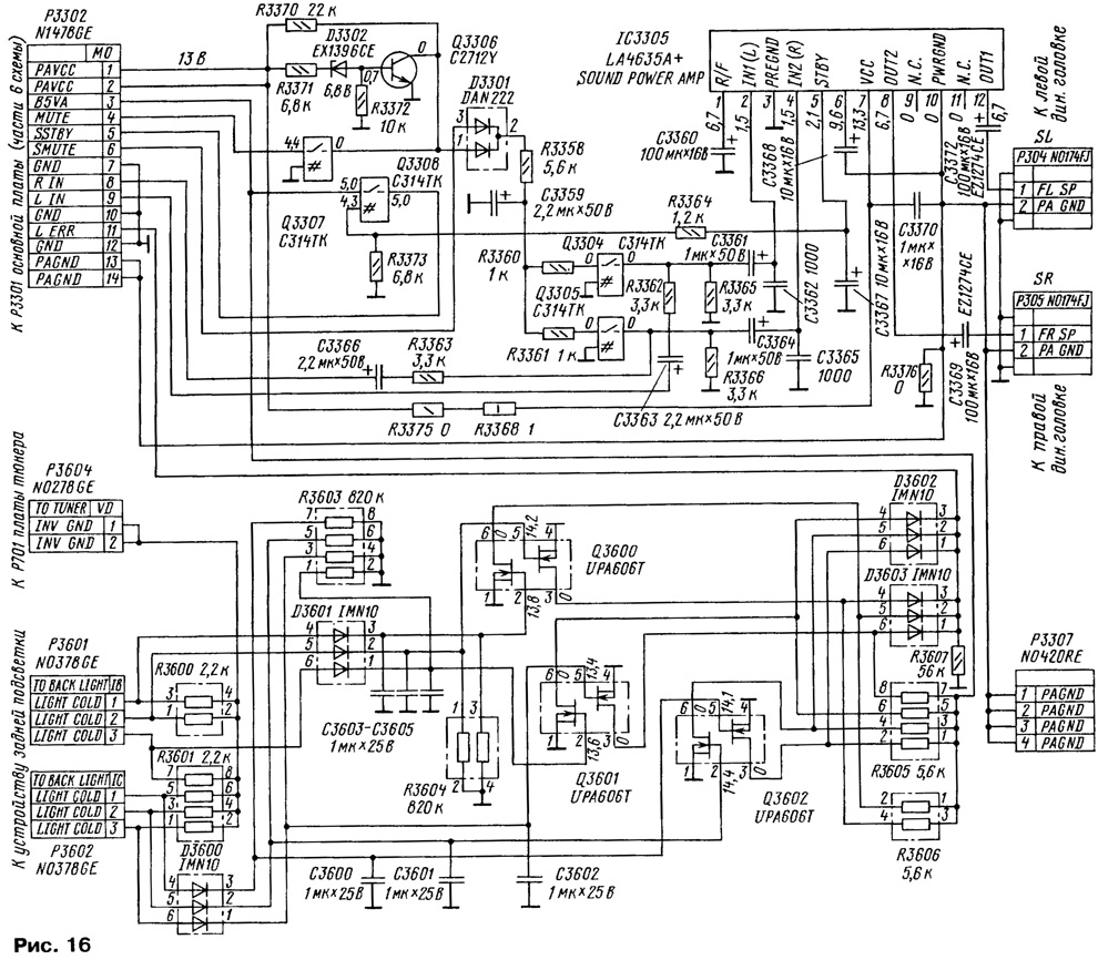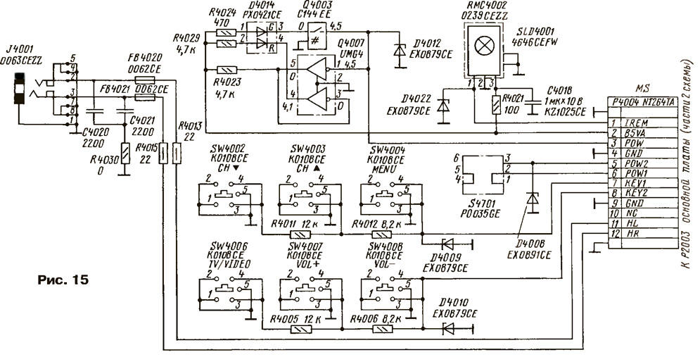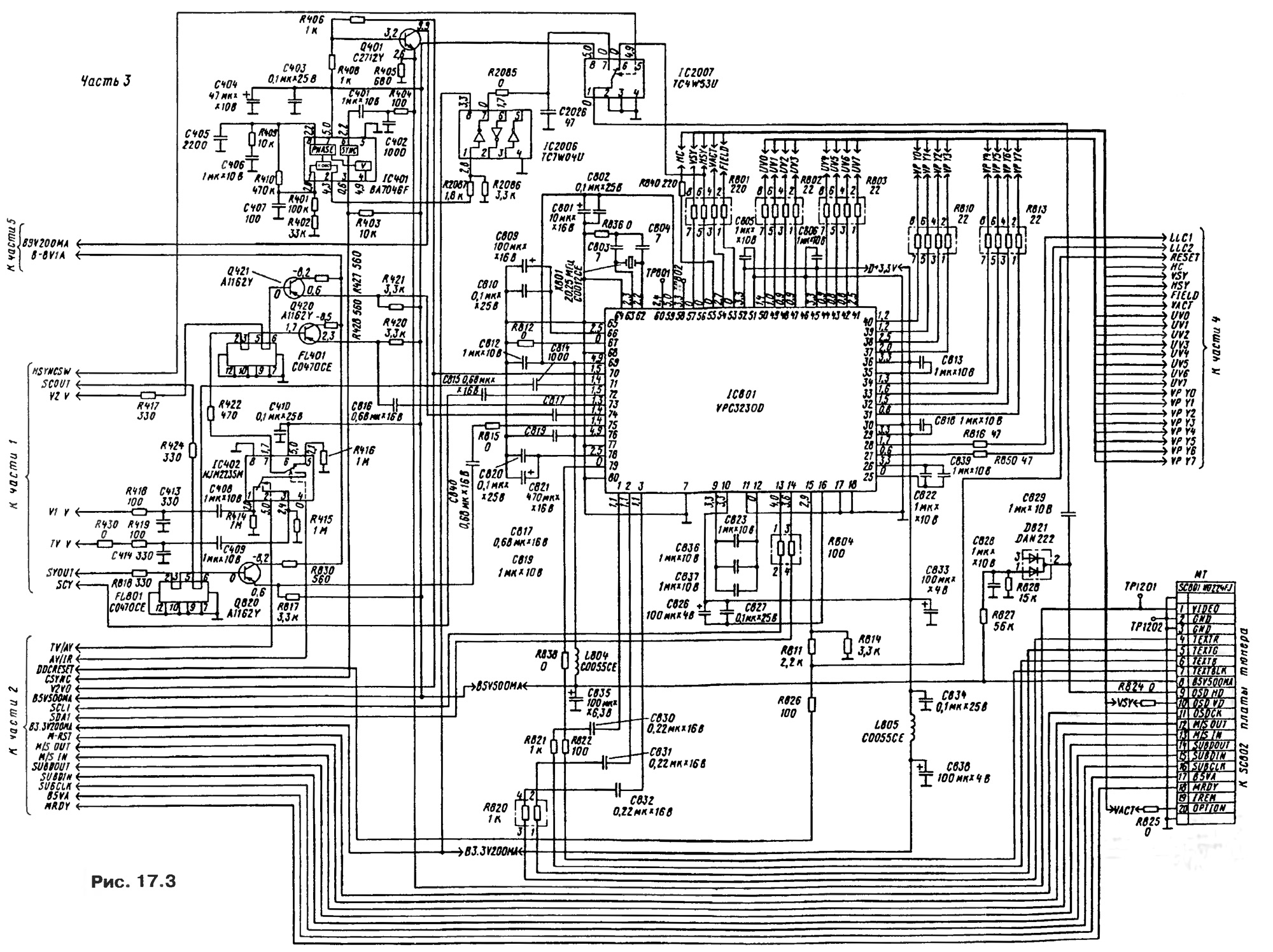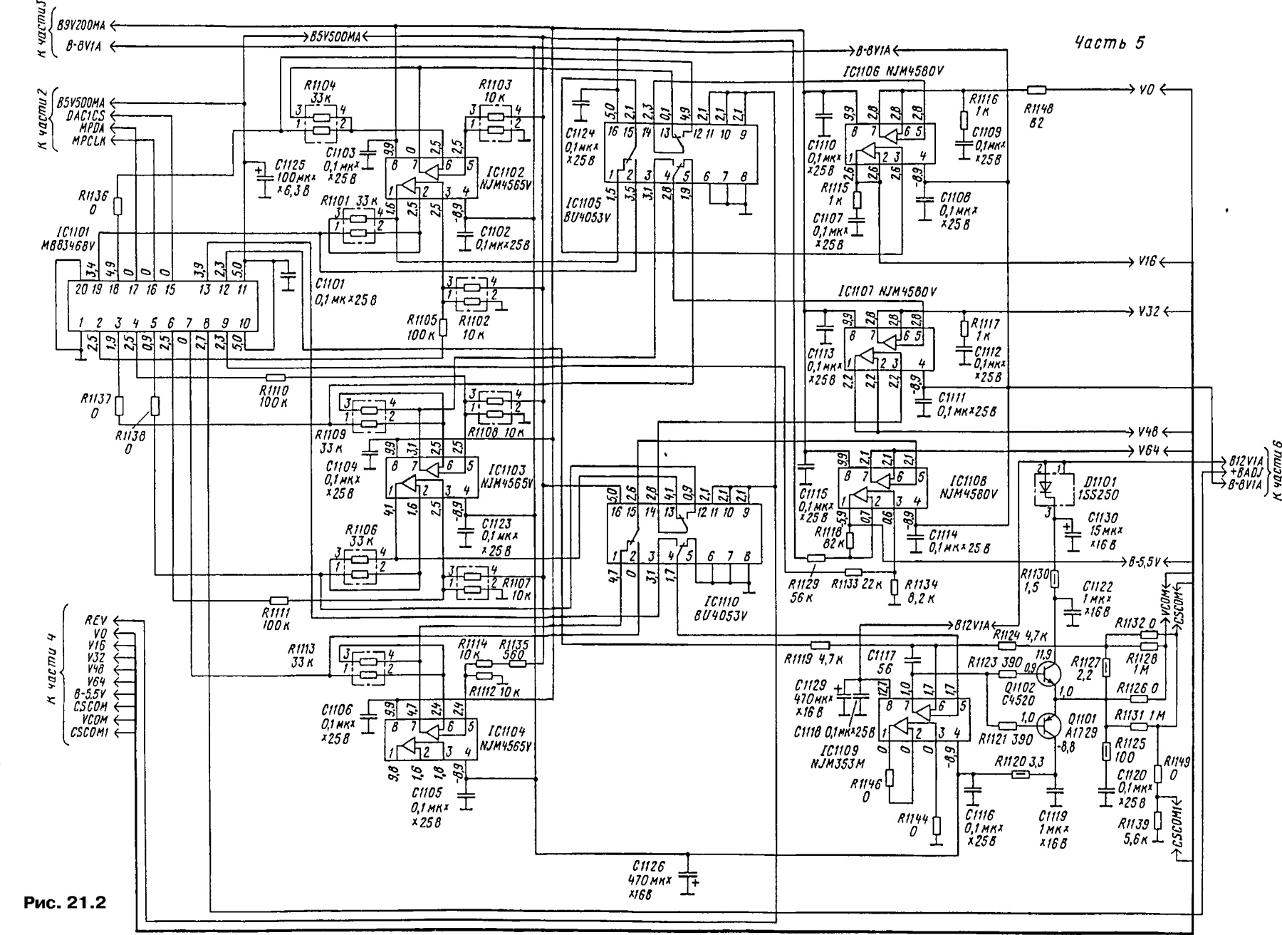 Значения устанавливают теми же кнопками VOLUME+ и VOLUME- на ПДУ. При ремонте таких телевизоров необходимо соблюдать не меньшую осторожность, чем при ремонте обычных телевизоров. Весьма желательно работать в антистатическом браслете и на электропроводящем коврике, так как все панели "боятся" электростатических зарядов. Прежде чем приступить к ремонту, необходимо убедиться в правильности установки параметров так, как это описано выше. Для ориентирования при ремонте на рис. 25 представлено размещение плат и других устройств в телевизоре, а также расположение разъемов. Широкими черными стрелками на нем показаны направления поиска разъемов для облегчения снятия и установки плат. Рассмотрим возможные неисправности телевизора на конкретных примерах. 1. Нет изображения и звука. Прежде всего проверяют целостность предохранителей F2-F4 на плате тюнера (см. рис. 14). Если какой-нибудь из них (или несколько) имеет обрыв, то проверяют цепи нагрузки на отсутствие короткого замыкания. При его обнаружении прежде всего проверяют исправность трансформатора T701 источника питания и транзисторов Q702, Q751, Q753 и ключевого элемента Q752 основной платы (см. рис. 21, часть 6). Если короткого замыкания нет, проверяют наличие постоянных напряжений на выходах выпрямителей и стабилизаторов источника питания. При отсутствии всех напряжений питания проверяют исправность микросхемы IC702, транзисторов Q702, Q703, а также отсутствие обрыва предохранителей FB701, FB708, FB709 и первичных обмоток трансформатора Т701. При отсутствии какого-нибудь одного питающего напряжения проверяют исправность соответствующего выпрямителя во вторичных цепях трансформатора Т701 и стабилизатора напряжения. 2. Нет изображения. Проверяют наличие цифровых видеосигналов на соответствующих выводах микросхем IC801 (см. рис. 17, часть 3) и IC1201 (см. рис. 21, часть 4) основной платы. Если обнаружено их отсутствие на выходах той или иной микросхемы, то прежде, чем их заменять (это делают в самую последнюю очередь), проверяют режим микросхемы по постоянному току. Он не должен отличаться от указанного на принципиальной схеме более чем на ±10 %. Лишь после этого принимают решение о замене микросхемы или какого-нибудь из окружающих ее элементов. Если же на выходах микросхемы IC1201 присутствуют необходимые видеосигналы и они поступают на ЖК панель, то вначале проверяют поступление сигналов и напряжений на микросхему IC1205, а затем - исправность ее самой, а также поступление мультиплексированных сигналов на панель. Проверяют также поступление образцового напряжения REF с микросхемы IC1201 (см. рис. 21, часть 4) на устройство градуированных напряжений (см. рис. 21, часть 5), исправность входящих в него микросхем IC1102- IC1108, IC1110 и наличие градуированных напряжений на контактах разъемов панели (см. рис. 21, часть 4). В заключение обследования делают вывод о неисправности самой панели. 3. Нет изображения при подаче сигнала на антенный вход. Сначала проверяют наличие напряжений 5, 9, 12 и 31 В на соответствующих контактах разъемов тюнера (см. рис. 14). Необходимо иметь в виду, что если напряжения 5,12 и 31 В поступают с источника питания, находящегося на основной плате, то напряжение 9 В стабилизируется микросхемой 15 платы тюнера, которая может выйти из строя. Проверяют также другие стабилизаторы - микросхемы НО, И1 и транзисторы Q18 и Q28, находящиеся на плате тюнера