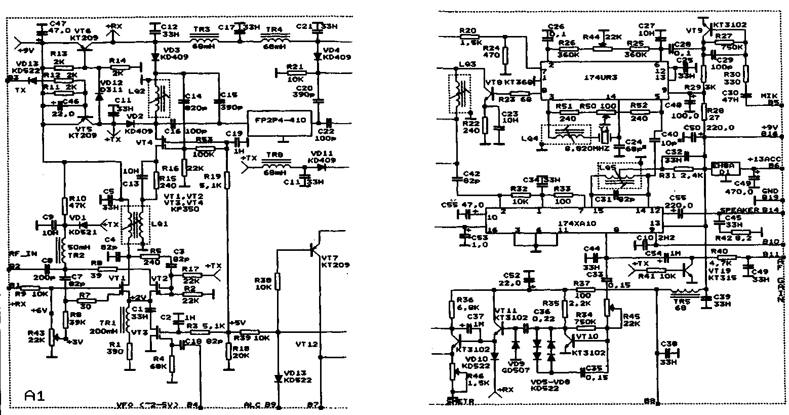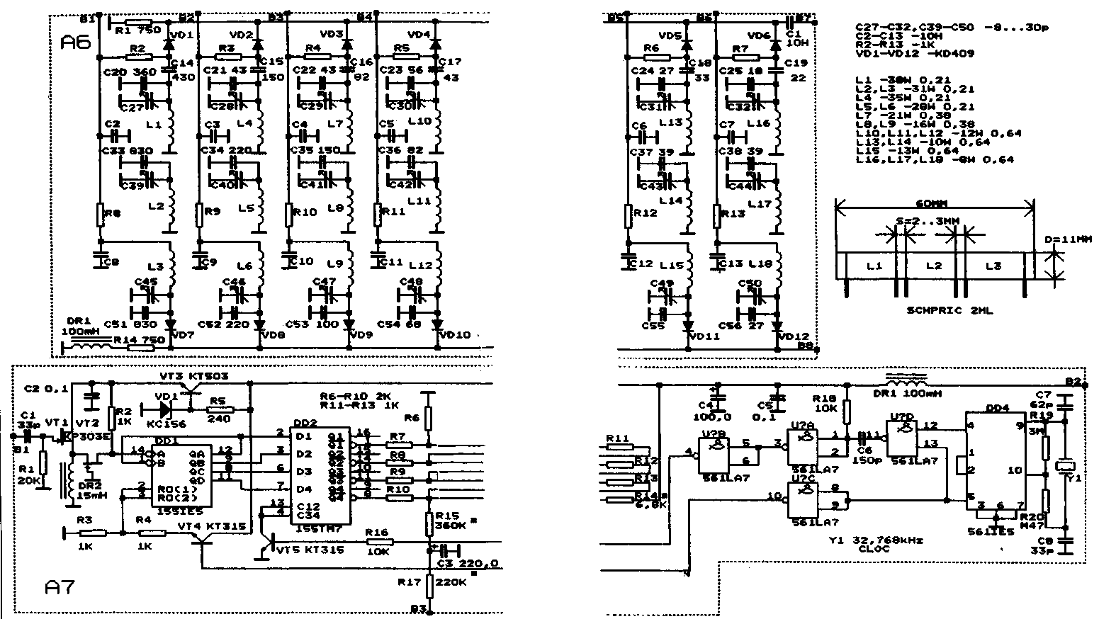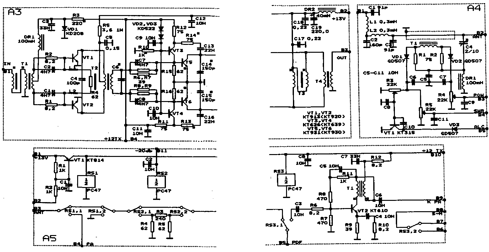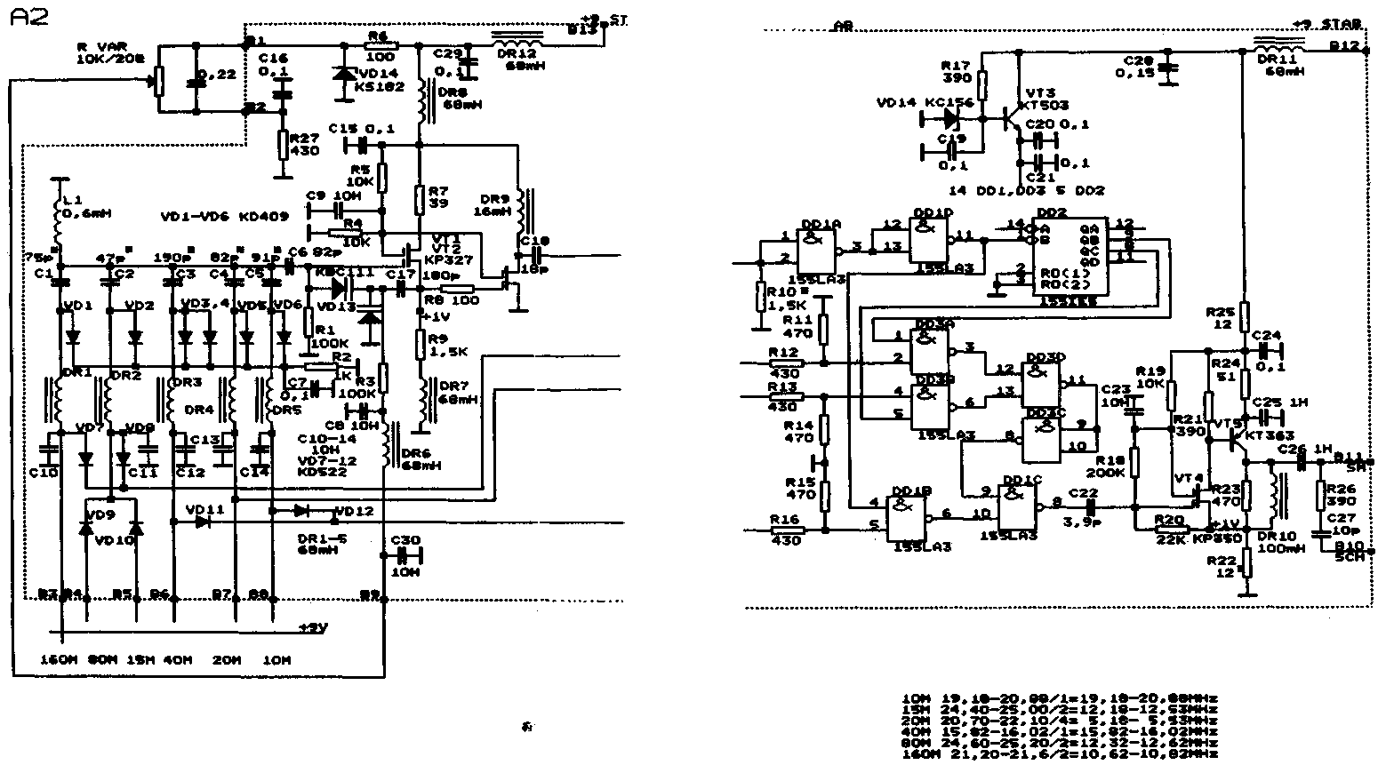 Трансивер работает в режиме SSB на диапазонах 1,9; 3,5; 7; 14; 21; 28 МГц как от автомобильного так и от сетевого блока питания. В нем используется одно преобразование с промежуточной частотой 8,82 МГц, определяемой выбранным кварцевым фильтром. Блок-схема трансивера приводится на рис.1. Трансивер состоит из 7 блоков с минимально необходимым количеством органов управления. В режиме приема сигнал с антенного входа через аттенюатор (А5) и трехконтурный ДПФ (А6, рис.3), переключаемый диодами, поступает на смеситель приемника (VT1) в блоке (А1, рис.2). Работа подобного смесителя подробно описан а в [I]. Сигнал ПЧ, выделенный контуром L1, C4, поступает на реверсивный усилитель ПЧ (VT4) и далее на кварцевый фильтр типа ФП2П4-410 (из набора "Кварц-35"). При помощи L2, С15, С16 и L3, С20, С22 достигается неравномерность в полосе пропускания фильтра менее 1 дБ. Коммутация контуров осуществляется диодами VD2 ... 4, VD11 типа КД409. Далее, отфильтрованный сигнал ПЧ, через С42 проходит на вход усилителя ПЧ в микросхеме К174ХА10. Усиленный сигнал выделяется контуром L8, С31 и далее вместе с сигналом опорного генератора 8,82 МГц подается на вход SSB детектора - на 14 ножку микросхемы УПЧ. С выхода детектора низкочастотный сигнал через регулятор громкости подается на вход (9 ножка) усилителя низкой частоты и далее на телефоны или на динамик. Одновременно сигнал с детектора подается на усилитель АРУ (VT10 ... 12), чувствительность которого регулируется резистором R45. Для увеличения глубины АРУ введен транзистор VT7. К эмиттеру VT12 подключен прибор S-метра, на котором с достаточной точностью отображаются принимаемые сигналы с уровнями от S3 до S9 +20 дБ. Напряжение АРУ воздействует на затворы транзистора VT4 реверсивного усилителя (VT4). а также на второй затвор транзистора (VT3), который используется в качестве ключа смесителей RX / ТХ. На первый затвор (VT3) подается сигнал с ГПД (блок А 2, рис.4). ГПД собран по классической схеме на полевом транзисторе VT1 (блок А 2), где в качестве емкостного делителя исток-затвор используется варикап КВС111 (VD3). Перестройка по частоте осуществляется 20-ти оборотным переменным резистором (R-VAR). Вместо реле, которые нарушают тепловой баланс ГПД, для коммутации диапазонов применяются диоды КД409. ГПД генерирует сигналы с частотой от 15,82 МГц до 25,2 МГц с последующим делением. Коэффициент деления для каждого диапазона указан в таблице на рис.4 (блок А2). Сигнал ГПД через развязывающий каскад (VT2) приходит на цифровой коммутатор-делитель частоты. Необходимые частоты ГПД со стабильной амплитудой усиливаются транзисторами VT4, VT5 до уровня 4 - 5 В и подаются на смесители RX - ТХ, а также на входной формирователь ЦАПЧ на транзисторах VT1, 2 (блок А7, рис.3). Для формирования сигналов "счет, сброс и запись" в блоке А7 используются сигналы с частотой 1 и 2 Гц от микросхемы DD4, которая является кварцованным генератором-делителем частоты. С выходов делителя на 16 (блок А7. микросхема DD1) сигнал в коде 1-2-4-8, в конце счета переписывается в микросхему памяти DD2, откуда в том же коде цифровые сигналы с помощью матрицы R-2R формируют 16 ступенек постоянного напряжения, которое через сглаживающий фильтр R15, С3, R17 воздействует на варикап VD13, осуществляя подстройку частоты с целью ее стабилизации. Шаг перестройки ГПД, таким образом, равен 64 Гц. Это значит, что неточность настройки на корреспондента в среднем будет равна 32 Гц. В режиме передачи сиг