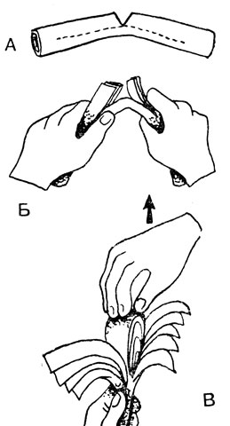 Òåïåðü ñëåäóåò âçÿòüñÿ äâóìÿ ïàëüöàìè ñâîáîäíîé ðóêè çà êðàé ïåðâîãî âíóòðåííåãî ìîñòèêà è ñïîêîéíî, àêêóðàòíî ïîòÿíóòü åãî ââåðõ âìåñòå ñ âíóòðåííèì ïåðâûì áóìàæíûì ñëîåì òðóáî÷åê (ðèñ. 6, Â). Êîãäà áóäåò âûòÿíóò ïåðâûé ñëîé äî êîíöà ëèíèè íàäðåçà, çà íèì ïîéäåò âòîðîé, òðåòèé è ò. ä. Âûòÿãèâàÿ êàæäûé ïîñëåäóþùèé ñëîé, íóæíî ñëåäèòü, ÷òîáû îí íå âûøåë äî êîíöà èç òðóáî÷êè, èíà÷å åëêà ñëîìàåòñÿ. Ôîêóñ, íåñìîòðÿ íà êàæóùóþñÿ ïðîñòîòó, òðåáóåò ïðåäâàðèòåëüíîé òðåíèðîâêè.