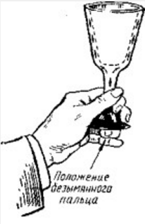 ×òîáû ñâîåâðåìåííî îáåñïå÷èòü ïîäà÷ó æèäêîñòè â áîêàë, èñïîëíèòåëþ íåîáõîäèìî çàïîìíèòü ïîëîæåíèå ïàëüöåâ. Äåðæàòü áîêàë ñëåäóåò çà íèæíþþ ÷àñòü íîæêè áîëüøèì óêàçàòåëüíûì è ñðåäíèì ïàëüöàìè, à áåçûìÿííûé ïàëåö áóäåò âûïîëíÿòü îñíîâíóþ ñåêðåòíóþ ôóíêöèþ. Îí äîëæåí íàõîäèòüñÿ ïîä çàêëååííîé ðåçèíîé ïîäñòàâêîé (ðèñ.6).