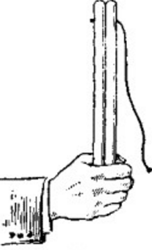 Åñëè ïàëî÷êè ñëîæèòü âìåñòå è äåðæàòü èõ â âåðòèêàëüíîì ïîëîæåíèè, òî âíóòðåííèå ãðóçèêè îïóñòÿòñÿ íà äíî.  ìîìåíò äåìîíñòðàöèè ôîêóñà, ïîâåðíóâ ïàëî÷êè â ãîðèçîíòàëüíîå ïîëîæåíèå, íàäî âûòÿíóòü âåðåâî÷êó èç îäíîé ïàëî÷êè (ðèñ.5).