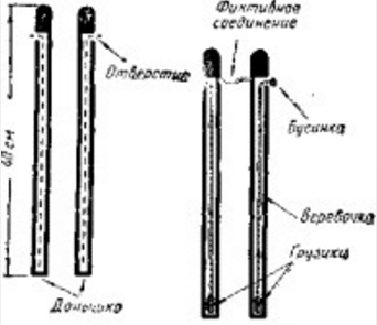 Äëÿ äàííîãî ôîêóñà òàêæå ïðåæäå âñåãî íåîáõîäèìî èçãîòîâèòü äâå ïàëî÷êè äëèíîé ïî 30-40 ñì. Âíóòðè ïàëî÷êè äîëæíû áûòü ïîëûìè, Íî íå ñêâîçíûìè, à ñ äîíûøêàìè.  âåðõíåé ÷àñòè ïàëî÷åê ñëåäóåò ñäåëàòü îòâåðñòèÿ, ïðîïóñòèâ â êàæäîå îòðåçîê âåðåâêè ñ ãðóçèêîì íà êîíöå. Ýòè âíóòðåííèå ãðóçèêè äîëæíû áûòü äîâîëüíî òÿæåëûìè: ëó÷øå âñåãî èõ ñäåëàòü èç îëîâà. Íà âûâåäåííûå íàðóæó êîíöû âåðåâîê íàäåâàþòñÿ áóñèíêè, ÷òîáû âåðåâî÷êà íå ïðîñêî÷èëà â îòâåðñòèå (ðèñ.4).