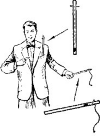 Ïîñëå ýòîãî àðòèñò áåðåò îäíó èç ïàëî÷åê è âñòàâëÿåò â âåðõíèé êàðìàí ïèäæàêà. Çðèòåëè ñòàíîâÿòñÿ ñâèäåòåëÿìè ñîâñåì çàáàâíîé êàðòèíû: èñïîëíèòåëü òÿíåò âåðåâî÷êó èç ïàëî÷êè, êîòîðóþ äåðæèò â ðóêå, à âòÿãèâàåòñÿ âåðåâî÷êà â ïàëî÷êó, òîð÷àùóþ èç êàðìàíà ïèäæàêà.