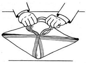 Ïîëó÷èâ îò ïóáëèêè íîæ îáðàòíî, ïðèæìèòå ìîíåòó ê îäíîé ñòîðîíå åãî ëåçâèÿ, ê ñåðåäèíå, è ïîëîæèòå íîæ íà ñòîë; ìîíåòà îñòàíåòñÿ ïðèëèïøåé ê åãî íèæíåé ñòîðîíå. Ïîòîì, çàõâàòèâ ïëàòîê, è, äóíóâ íà åãî öåíòð, ðàçíèìèòå áûñòðî ðóêè.