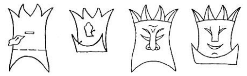 Ðàñêðàñüòå äåòàëè, êàê ïîêàçàíî íà ðèñóíêàõ. Âñòàâüòå â êàðòèíêó íîñ. Êîãäà "íîñ" è "âîðîòíèê" îïóùåíû, òî ñ ëèöåâîé ñòîðîíû ïîëó÷àåòñÿ ãîëîâà êîðîëÿ.