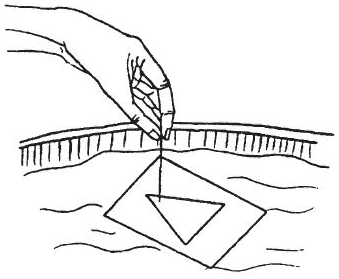 Íàðèñóéòå íà ìàëåíüêîì êâàäðàòíîì ëèñòêå áóìàãè êàêóþ-íèáóäü ãåîìåòðè÷åñêóþ ôèãóðó, íàïðèìåð òðåóãîëüíèê. Íî ðèñóéòå êàðàíäàøîì, ñìî÷åííûì âîäîé. Ïóñòèòå ëèñòîê ïëàâàòü â âîäó êâåðõó ðèñóíêîì è îñòîðîæíî çàïîëíèòå íàðèñîâàííóþ ôèãóðó âîäîé. Ýòî áóäåò íå î÷åíü òðóäíî, òàê êàê âëàæíûå ëèíèè, ïðîâåäåííûå ìîêðûì êàðàíäàøîì, áóäóò ñëóæèòü ãðàíèöàìè ðèñóíêà è ïîìåøàþò âîäå ðàñòå÷üñÿ çà ýòè ãðàíè.