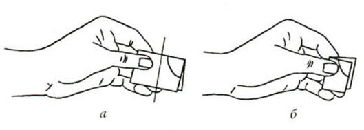 Âîçüìèòå ñîãíóòûé ëèñòîê ïðàâîé ðóêîé òàê, ÷òîáû óòîëîê ñ çàïèñüþ íàõîäèëñÿ ñâåðõó ñïðàâà (ðèñ.à). Ðàçîðâèòå ñâåðõó âíèç ïî öåíòðàëüíîé ëèíèè è ïîìåñòèòå ÷àñòü èç ëåâîé ðóêè ïåðåä ÷àñòüþ â ïðàâîé ðóêå (ðèñ. á).