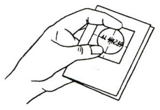 Ïðàâîé ðóêîé âîçüìèòå áëîêíîò è ïðèæìèòå ñïðÿòàííûé êëî÷îê áîëüøèì ïàëüöåì ê ëèñòêó, îáðàùåííîìó ê âàì. Ïåðåõâàòèòå áëîêíîò ëåâîé ðóêîé è ïîä ïðèêðûòèåì áëîêíîòà ðàçâåðíèòå áóìàæêó ñ íàäïèñüþ (ðèñ.â).