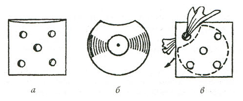 Äåðæà ãðàìïëàñòèíêó â ðóêå, äðóãîé ðóêîé ïîäíèìèòå ââåðõ êîíâåðò, è çðèòåëè óâèäÿò, ÷òî âáëèçè êàæäîãî èç ÷åòûðåõ óãëîâ êîíâåðòà ïðîäåëàíî ïî ñêâîçíîìó îòâåðñòèþ (ðèñ. à).
