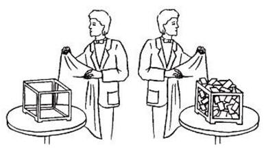 Íà ñòîëèêå ñòîèò ñòåêëÿííàÿ êîðîáêà, ïîõîæàÿ íà àêâàðèóì. Íàêðîéòå åå øàëüþ. Çàòåì ñäåðíèòå øàëü - êîðîáêà ïîëíà äåíåæíûõ êóïþð. Ïîâòîðèòå âñå â îáðàòíîì ïîðÿäêå - è êîðîáêà âíîâü ïóñòàÿ.