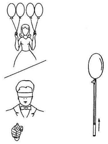 Ñòîÿ ê ñöåíå ñïèíîé â öåíòðå çàëà, çàâÿæèòå ãëàçà ïîâÿçêîé è, äåðæà ïèñòîëåò íà èçãîòîâêó, ñêàæèòå çðèòåëÿì, ÷òîáû îíè íàçâàëè öâåò îäíîãî èç øàðèêîâ. Êàê òîëüêî îíè ïðîèçíåñóò, íàïðèìåð, "æåëòûé öâåò", ñðàçó æå ïîâåðíèòåñü ê ñöåíå è âûñòðåëèòå.  òî æå ìãíîâåíèå æåëòûé øàðèê ëîïíåò. Êàæäûé ðàç, âîçâðàùàÿñü â èñõîäíîå ïîëîæåíèå, òî÷íî òàê æå ïðîñòðåëèâàéòå è îñòàëüíûå øàðèêè íàçâàííûõ öâåòîâ.