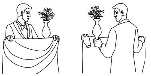 Ïîñòàâüòå íà ñòîëèê âàçó ñ öâåòàìè. Âîçüìèòå â ðóêè ïëàòîê, ïîäíèìèòå åãî çà äâà óãëà ïåðåä âàçîé, çàêðûâ åå îò çðèòåëåé. Âàçà ñ öâåòàìè ñòàíåò ìåäëåííî ïîäíèìàòüñÿ, äâèãàòüñÿ âäîëü âåðõíåãî êðàÿ ïëàòêà, çàòåì ñíîâà ñêðîåòñÿ çà íèì. Ïîòîì óáåðèòå ïëàòîê, è çðèòåëè óâèäÿò, ÷òî âàçà êàê ñòîÿëà, òàê è ñòîèò íà ïðåæíåì ìåñòå.