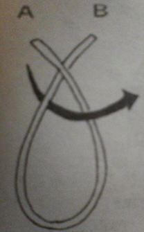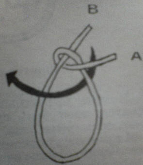 Ïðèãëàñèòå äâóõ àññèñòåíòîâ. Äåðæèòå âåðåâêó (äëèíîé 1 ì) íà ðàññòîÿíèè ïðèìåðíî 13 ñì îò êîíöîâ. Ïåðåêðåñòèòå êîíöû âåðåâêè òàê, ÷òîáû ïðàâûé êîíåö îêàçàëñÿ ïîâåðõ ëåâîãî (ñ âàøåé ñòîðîíû) è â ìåñòå ïåðåñå÷åíèÿ çàæìèòå ïàëüöàìè ëåâîé ðóêè. Ïðîäåðíèòå êîíåö À ÷åðåç ïåòëþ è ïðîòÿíèòå åãî âïðàâî íà íåñêîëüêî ñàíòèìåòðîâ è ïîñëå ýòîãî ïåðåäàéòå àññèñòåíòó, ïîïðîñèâ åãî íà ìèíóòêó ïîäåðæàòü ýòîò êîíåö. Áûñòðî ïåðåëîæèòå ìåñòî ïåðåñå÷åíèÿ (òåïåðü óæå ïðåâðàòèâøååñÿ â óçåë) â ïðàâóþ ðóêó è äåðæèòå âåðåâêó â ìåñòå ïåðåñå÷åíèÿ ïàëüöàìè ïðàâîé ðóêè.