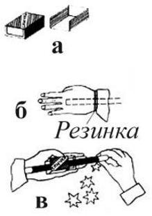 Ó ÿùè÷êà ñïè÷å÷íîãî êîðîáêà îòðåæüòå îäíó èç óçêèõ ñòåíîê (ðèñ. à), çàäâèíüòå ÿùè÷åê â ôóòëÿð è ñïðÿ÷üòå êîðîáîê â êàðìàí. Ïàëî÷êó çàñóíüòå â ëåâûé ðóêàâ ïèäæàêà òàê, ÷òîáû îíà ëåãëà íà ïðåäïëå÷üå, çàôèêñèðóéòå åå ïðè ïîìîùè ðåçèíîâîãî àïòå÷íîãî êîëüöà â ðàéîíå çàïÿñòüÿ (ðèñ. á). Âî âðåìÿ äåìîíñòðàöèè äîñòàåòå ñïè÷å÷íûé êîðîáîê è ïåðåêëàäûâàåòå åãî â ëåâóþ ðóêó. Çðèòåëè íå äîëæíû âèäåòü, ÷òî îäíà èç ñòåíîê îòñóòñòâóåò. Ïåðåêëàäûâàÿ êîðîáîê â ëåâóþ ðóêó, âû íàäåâàåòå åãî íà êîíåö ïàëî÷êè.