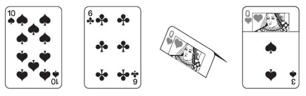 3. Слегка помашите рукой и внезапно выбросьте руку по направлению к столу, держа ее ладонью вниз, так чтобы никто не видел лицевую сторону карт, и бросьте даму на стол справа налево. Если вы потренируетесь, то обнаружите, что это очень легко сделать, не бросая вторую карту (в нашем случае десятку пик) или давая ей упасть вслед за дамой. Когда вы уберете правую руку, выбросьте вперед левую и бросьте шестерку треф на стол лицом вниз, в правую сторону. Затем, когда будете убирать левую руку, правая рука бросает десятку пик в центр между двумя другими картами. Все это вы должны делать очень быстро, и все время надо быть уверенным, что лица карт не видны - ваши зрители не должны их видеть.