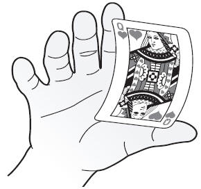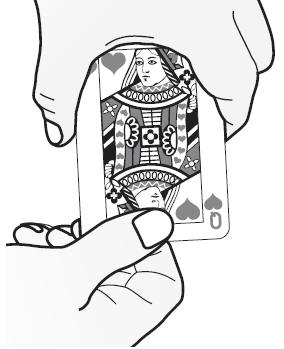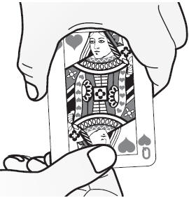Повтор фокуса Если вас попросят повторить фокус, не отказывайтесь - просто возьмите даму червей и две простые карты и скажите: "Хорошо, смотрите". 1. Вы можете дать зрителям проверить карты, если они захотят. Поместите даму в правую руку, держите ее между большим и указательным пальцами, которые разворачивают карту влево, если смотреть из публики (см. рисунок). Слегка выгните карту и скажите: "Дама".