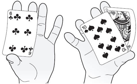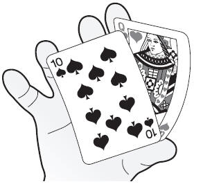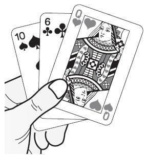 2. Возьмите следующую карту (предположим, это десятка пик) и поместите ее перед дамой, держа большим пальцем низ карты, а средним и безымянным верх; снова слегка выгните (см. рисунок). Скажите: "Десятка". Возьмите третью карту (пусть это будет шестерка треф) и держите ее таким же образом в левой руке между большим и указательным и средним пальцами. Скажите: "Шестерка".