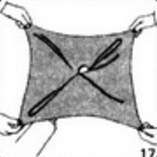 16. Примечание. В этот момент заимствованное у зрителя кольцо зажато безымянным пальцем и мизинцем левой руки под платком. Монета теперь находится над платком в "колодце". Большой и указательный пальцы левой руки удерживают ткань платка и монету через нее: зрители думают, что вы держали монету именно так с самого начала. 17. Левая рука продолжает держать монету и кольцо, и вы предлагаете зрителям плавно потянуть за четыре угла платка. Отпуская пальцы левой руки, позвольте монете медленно появиться из "колодца" в центре платка. Для зрителей появление монеты будет выглядеть так, будто монета проходит сквозь кольцо, диаметр которого много меньше монеты.