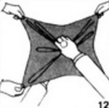 9. Важное примечание. С этого момента и далее, до тех пор, пока монета не "пройдет" сквозь кольцо (этап 17), левой рукой удерживайте центр платка, чтобы зрители не догадались, что вы взяли монету. 10. Под платком тайно переведите монету в позицию Ладонь-пальцы в правой руке. Далее средний и безымянный пальцы правой руки удерживают монету в ладони, а указательный и большой пальцы стягивают кольцо с платка и передают его в левую руку, где вы удерживаете его безымянным пальцем и мизинцем.