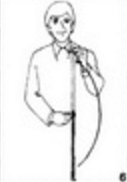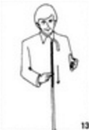 12. Затем медленно и торжественно освободите верхний конец веревки, отведя левую руку в сторону. Правой рукой вы крепко держите за нижний конец проволоки, находящийся в верхней половине веревки. К изумлению публики, веревка "стоит"! Показывая, что она стоит, а не висит, вы проводите левой рукой вокруг верхнего конца веревки.