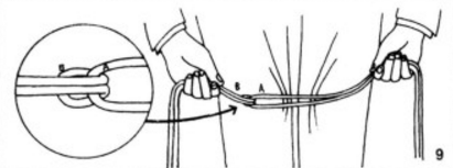 10. Соединенные "крючком" петли должны быть заведены точно во внутренний изгиб левого колена, чтобы, садясь, вы крепко зажали их под коленом. Далее левая рука выскальзывает из-под колена наружу по веревке.