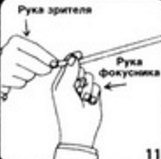 ЭФФЕКТНЫЕ ФОКУСЫ И ИХ РАЗГАДКИ Кольцо соскакивает с веревки. Секрет фокуса Справочник / Эффектные фокусы и их разгадки Описание фокуса: Фокусник заимствует кольцо у зрителя. Он просит его надеть кольцо на метровую веревку. Веревку берут за концы два зрителя, каждый со своей стороны, но фокусник магически заставляет кольцо соскочить с веревки в ее середине! Кольцо немедленно возвращается владельцу. Публике предоставляется возможность проверить целостность и кольца, и веревки. Секрет фокуса: 1. Обратившись к публике, не одолжит ли кто-нибудь кольцо на время фокуса, вы одновременно предлагаете публике проверить, цела ли веревка. Когда из зала вам возвращают веревку, вы приглашаете на сцену зрителя и просите его продеть веревку в кольцо. 2. Положите веревку с надетым на нее кольцом на правую руку, развернутую ладонью вверх. Кольцо должно лежать у основания указательного пальца, а веревка свисает по сторонам ладони. 3. Демонстрируя веревку с кольцом зрителям, заметьте, что кольцо невозможно снять, не дав ему пройти по веревке до любого конца. С этими словами зажмите кольцо в кулак и разверните руку тыльной стороной вверх. Кольцо вы свободно держите у самого края кулака. 4. На этом рисунке показано, как вы должны держать кольцо в кулаке. 5. Примечание. Чтобы скрыть кольцо от взглядов зрителей, вы можете поднять большой палец и закрыть им открытую часть кулака, через которую можно увидеть кольцо в вашей руке. 6. Удерживая кольцо и веревку в такой позиции, протяните левую руку через правую и возьмите левой рукой веревку в том месте, где она выходит из правой. Пусть ваша левая рука скользнет вдоль веревки и передаст правый конец веревки зрителю, стоящему с этой стороны. Попросите его держать конец, не выпуская. 7. Когда зритель возьмет в руку правый конец веревки, ваша левая ладонь с полусогнутыми пальцами должна скользнуть вдоль веревки и переместиться под правый кулак. 8. Именно в тот момент, когда левая рука оказалась под правым кулаком, вы слегка наклоняете правую кисть влево и ослабляете нажим указательного пальца правой руки. Кольцо выскальзывает из кулака в пальцы левой руки. Примечание. Передачу кольца надо выполнить чисто и без запинки. Если в движении левой руки возникнет пауза, даже едва заметная, публика поймет, что дело нечисто: происходит что-то подозрительное. В этом фокусе данное движение - ключевое. 9. Как только левая рука поймает кольцо, поднимите правую руку вверх. Посмотрите зрителю, стоящему справа, прямо в глаза и скажите: "Держите ваш конец чуть выше". 10. Примечание. Последнее представляет собой хороший пример отвлекающего маневра в момент главного тайного движения фокуса. Глядя в упор на зрителя, делая ему замечание, вы отводите его внимание от веревки на то мгновение, которое вам требуется для тайного движения. Поднимая вверх правую руку, вы заставляете публику следить глазами за ней, а не за левой рукой, которая тайно получила кольцо. 11. Поднимая правую руку, левой рукой вы тайно проводите кольцо до конца веревки и снимаете его, удержав в левой руке в позиции Ладонь-пальцы. Без запинки вы поднимаете конец и вручаете его зрителю, стоящему слева. Попросите его держать его крепко, не выпуская из руки. 12. Заведите левую руку под правый кулак. Быстро раскройте обе ладони и сложите вместе с веревкой между ними. Растирайте веревку л
