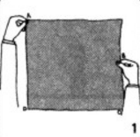 6. Затем перехватите платок левой рукой так, чтобы она удерживала его около центра. Не допускайте раскручивания платка в то время, когда вы перемещаете левую руку. Правая рука держит платок за верхний конец (за точку В).