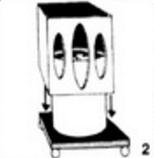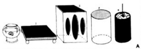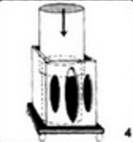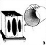А.Устройство, требующееся для этого фокуса, состоит из четырех частей. Часть 1-подставка с небольшим возвышением, Часть 2-квадратный профиль, в одной стороне которого прорезано несколько фигурных отверстий - "Квадрат", Часть 3-цилиндр, размер которого позволяет поместить его в профиль - "Круг", и Часть 4-трубка меньшего диаметра, помещающаяся в цилиндр. Эту трубка во время фокуса зрители не увидят вообще. В ней спрятано то, что вы покажете публике, и далее мы будем называть ее "Потайная камера". Верхняя поверхность подставки (Часть 1), все внутренние поверхности Квадрата, кроме вырезов, и наружная поверхность Потайной камеры покрыты черным бархатом. Снаружи Квадрат окрашен в яркий цвет - синий, зеленый или красный. Круг должен быть снаружи окрашен в какой-нибудь контрастный по отношению к Квадрату цвет-желтый, оранжевый или серебряный.