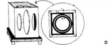 D. Теперь наденьте Квадрат на Потайную камеру. Вы увидите поразительную иллюзию. Сквозь прорези Квадрата видно, что он, без сомнения, внутри совершенно пуст. На этой иллюзии и основан фокус. Теперь наденьте на Потайную камеру Круг. Квадрат должен быть установлен прорезями к залу. Вы готовы показать фокус Квадратура круга.