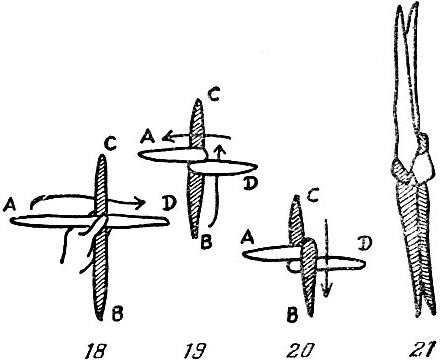 Êîíöû Â è Ñ ñîåäèíÿþòñÿ äðóã ñ äðóãîì âíèçó è áåðóòñÿ â ïðàâóþ ðóêó. Êîíöû À è D ñîåäèíÿþòñÿ íàâåðõó è áåðóòñÿ â ëåâóþ ðóêó (ðèñ. 21).