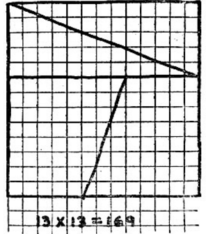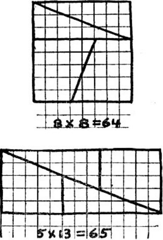 Если, например, взять квадрат в 13 х 13 единиц, то три его стороны следует разделить на отрезки длиной в 5 и 8 единиц, а затем разрезать, как показано на рис. 2. Площадь этого квадрата равна 169 квадратным единицам. Стороны прямоугольника, образованного частями квадратов, будут 21 и 8, что дает площадь в 168 квадратных единиц. Здесь благодаря перекрыванию частей вдоль диагонали одна квадратная единица не прибавляется, а теряется.