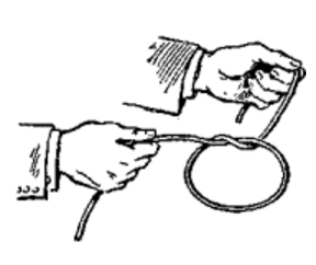 Среди реквизита фокусника на его столе лежит обыкновенная веревка, которая часто бывает нужна в домашнем обиходе. Исполнитель подходит к столу, берет эту веревку и показывает зрителям. "Обычная веревка", - думает зритель. И действительно, артист подтверждает это, завязав ее в узел, затем свернув ее вдвое жгутом (рис. 1).